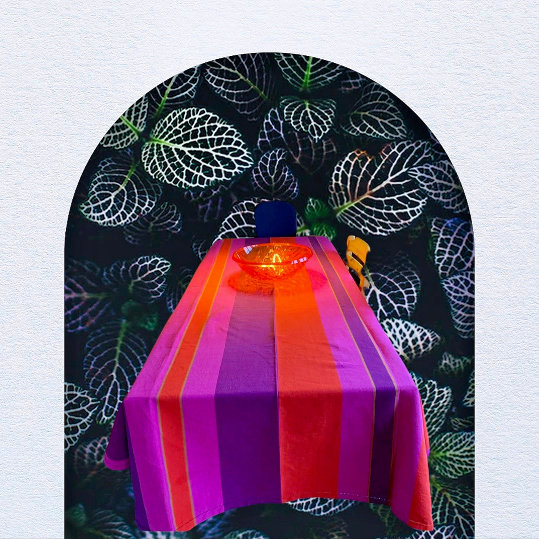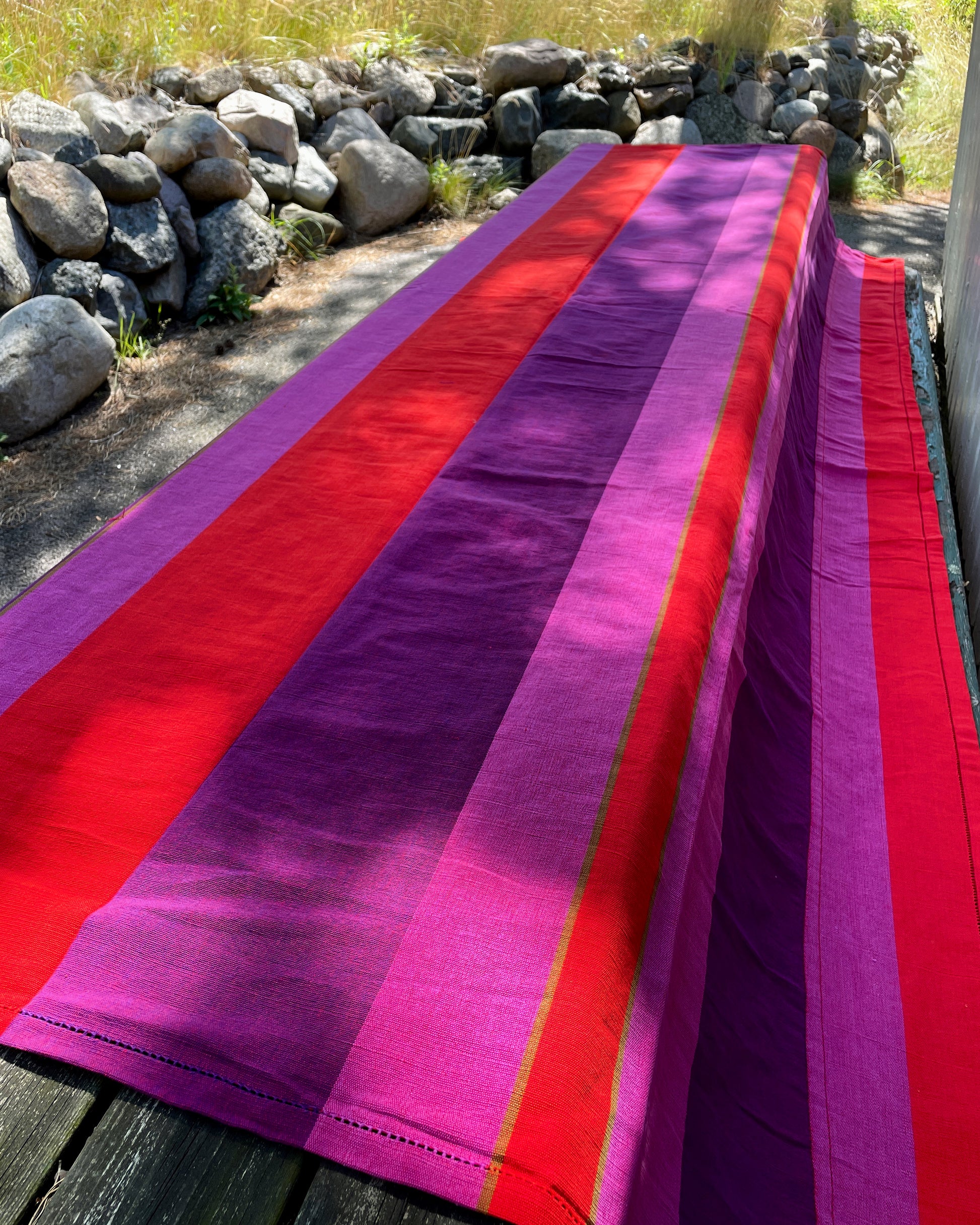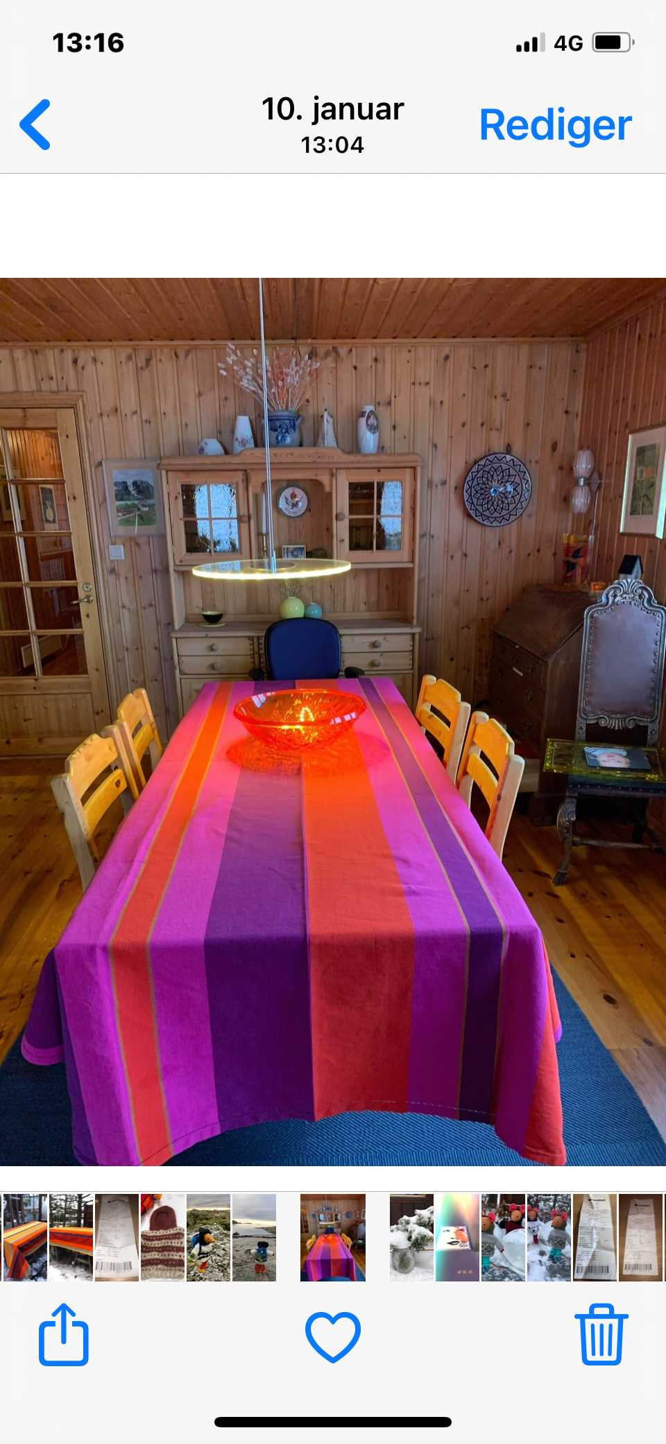 Duken er vevet av kraftig bomull-det gir den litt tyngde og gjør at den ligger støtt og pent på bordet. Den kan vaskes på 40 grader. Bør strekkes når den er våt. Fin både ustrøket og strøket. Det er håndsydd hullsøm langs alle kanter.