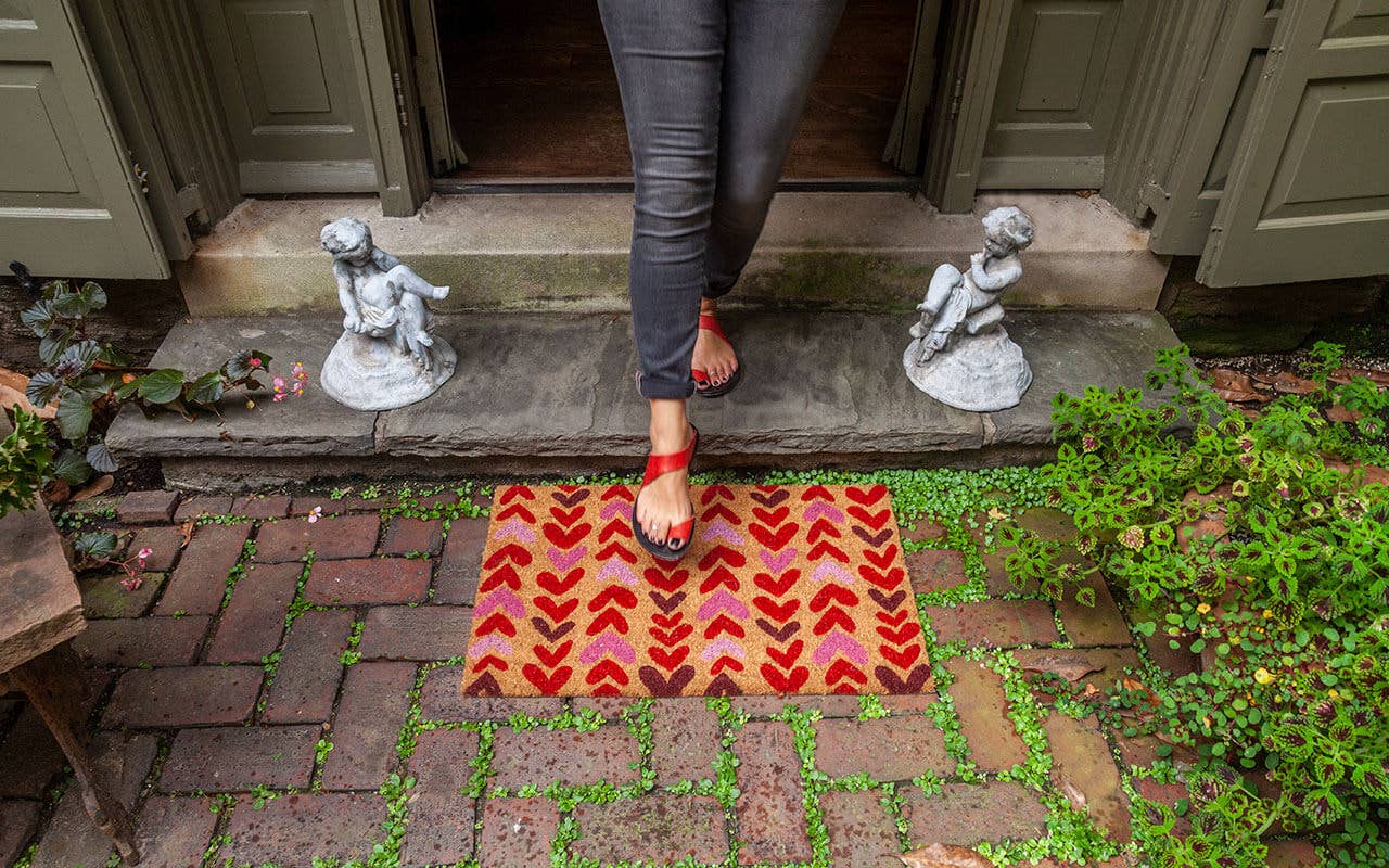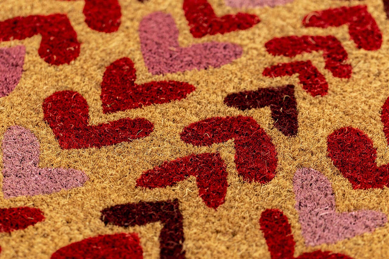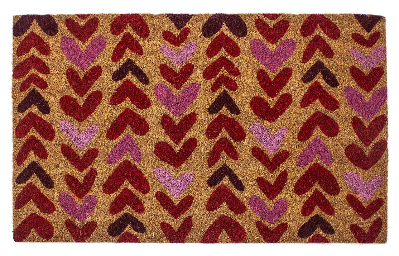 Heartwood betager med rækker af hjerteformede pile, der peger op og ned. Denne Entryways Sweet Home Collection dørmåtte måler 43 cm x 71 cm og er 15 mm tyk. Det er lavet af den helt naturlige kokos af højeste kvalitet og håndstencilet med miljøvenlige farvestoffer for langvarig vibration. Denne måtte har også en PVC-bagside.