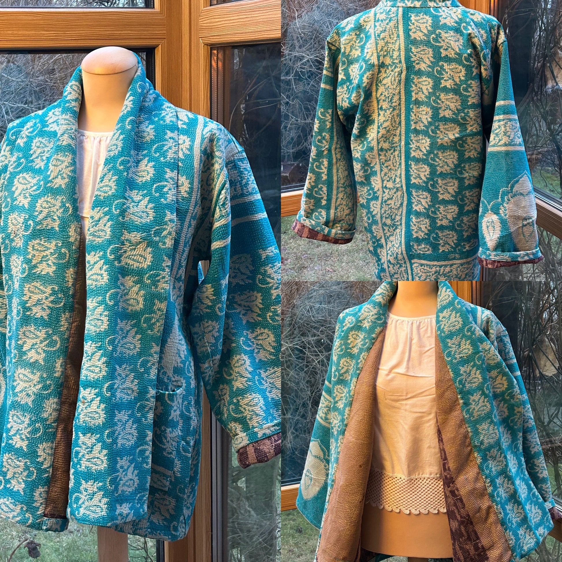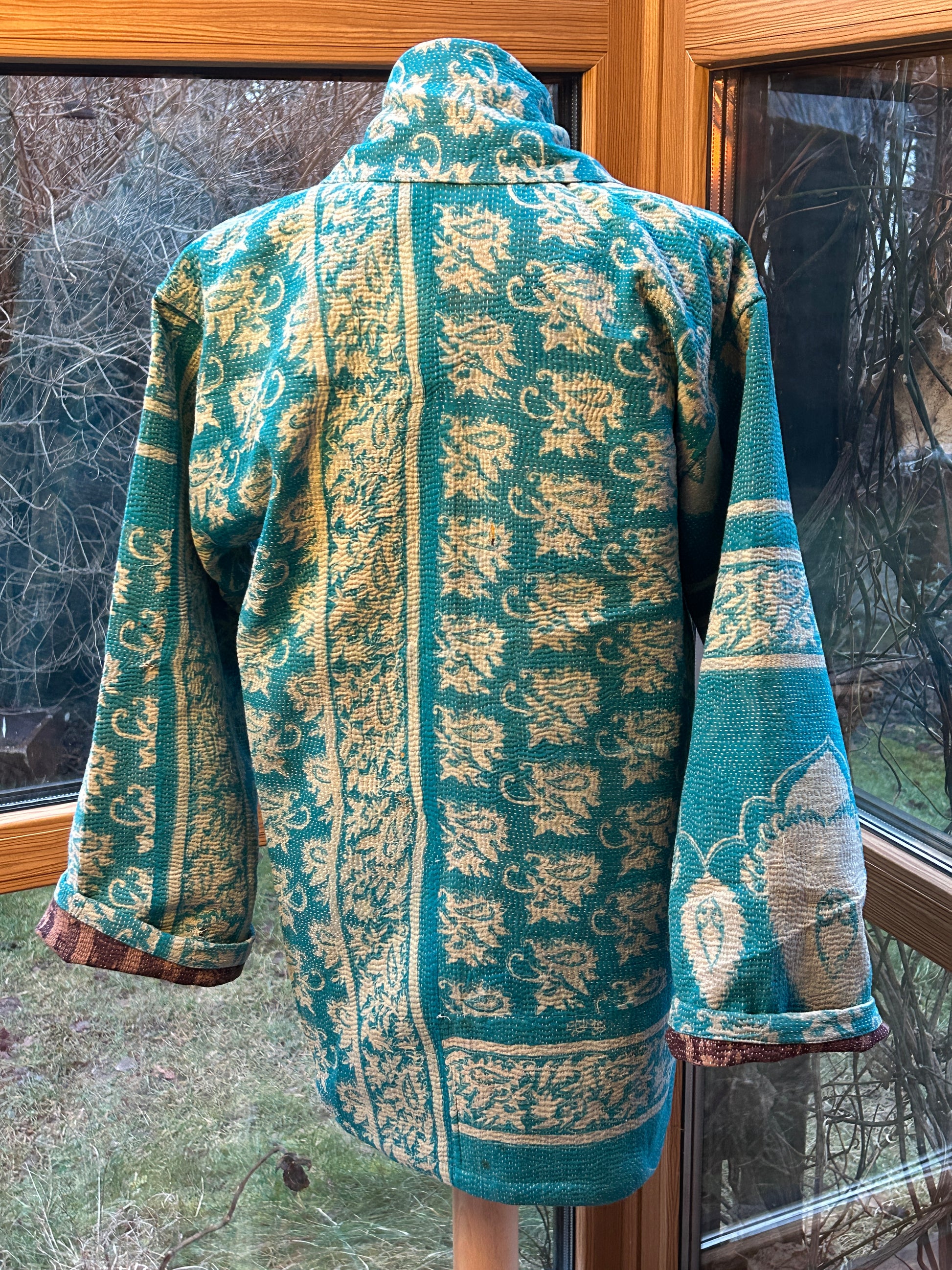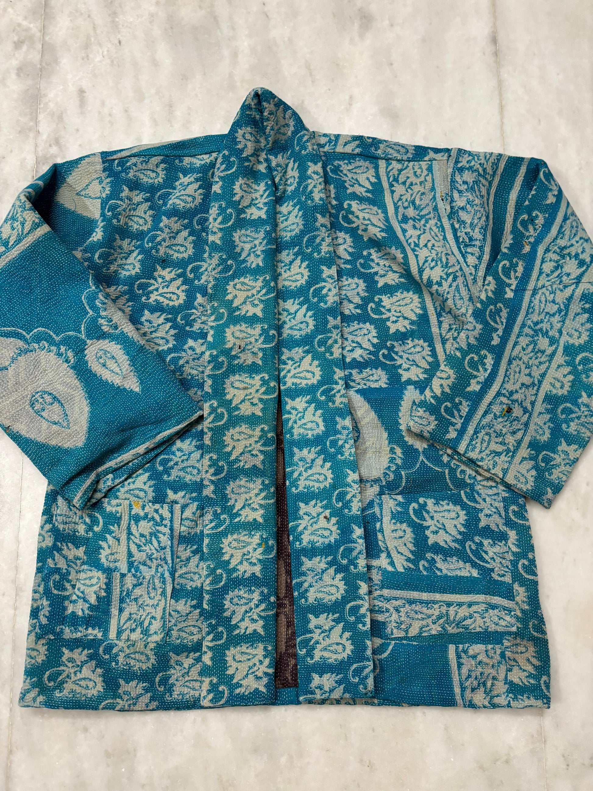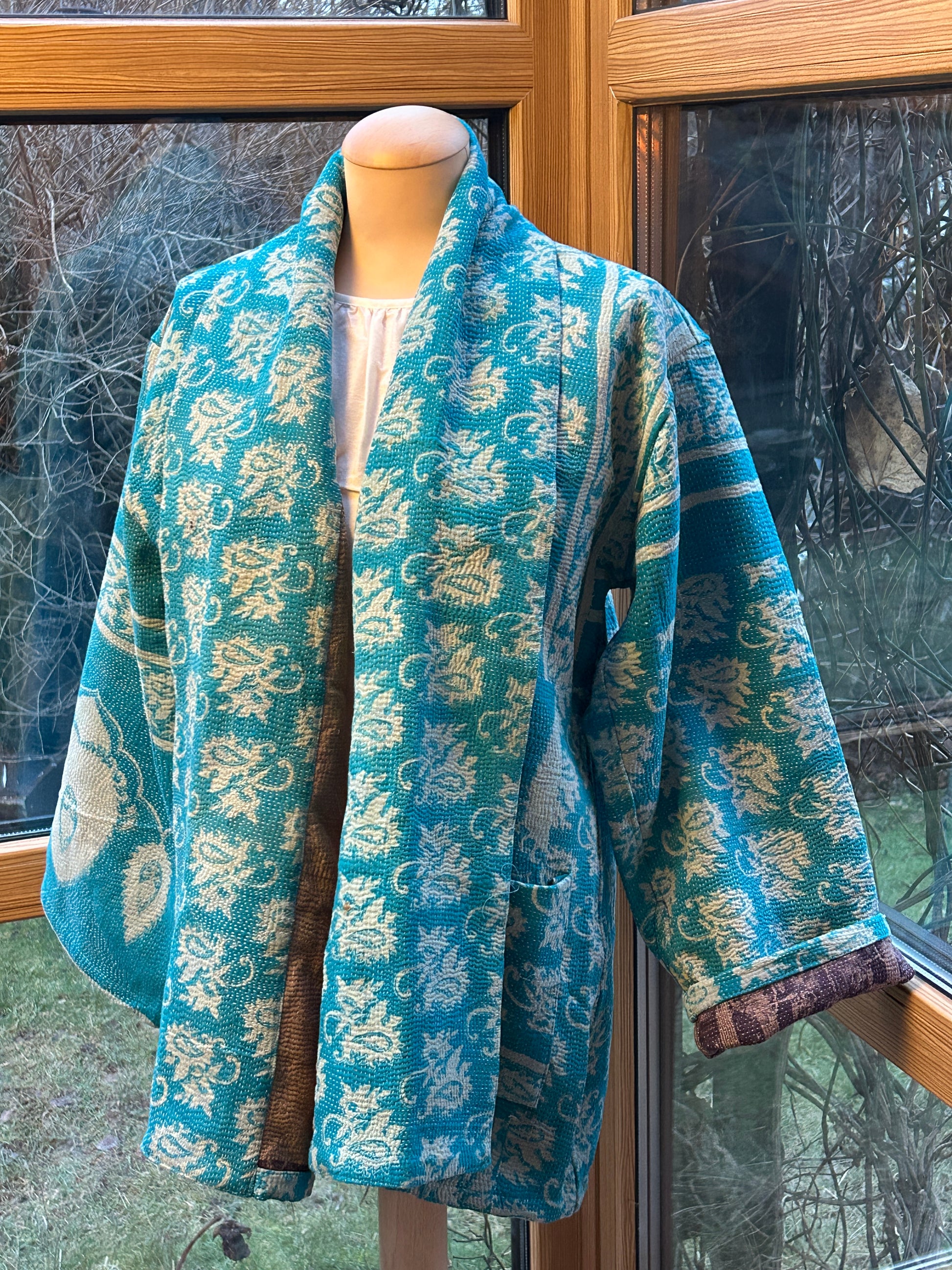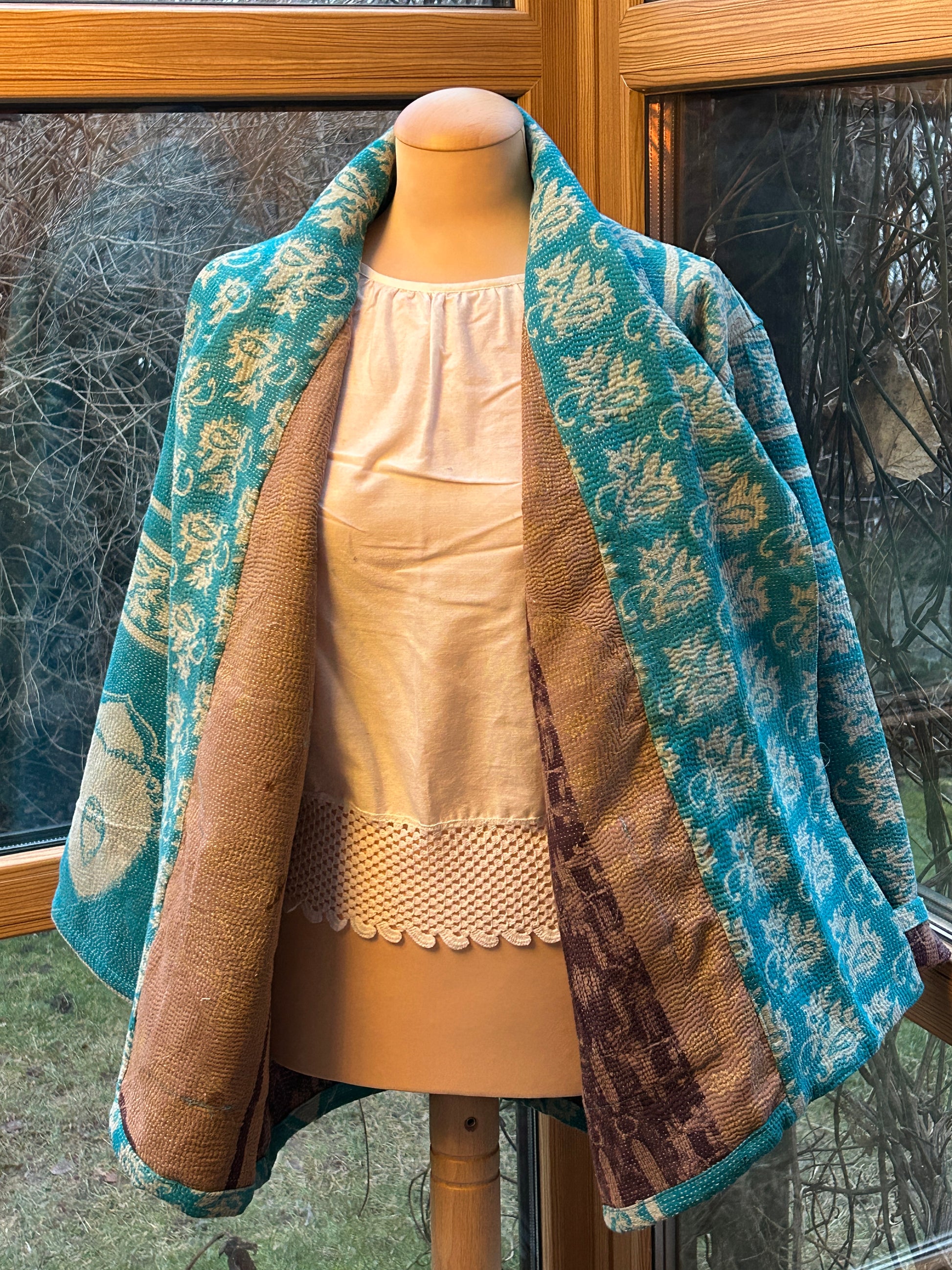 Felles for alle kanthaprodukter er at de blir sydd av resirkulerte materialer som legges oppå hverandre og sys sammen med "tråklesting", lag på lag.På den måten gis slitte stoffer nytt liv. Ikke sjelden synes små lapper og forsterkinger av stoffet. Dette gir plaggene sin sjarm. Tykkelsen på stoffet kan variere avhengig av hvor mange lag det består av. Denne vakre blå jakken m består av flere lag og egner seg for bruk også på kaldere dager.Dette er en romslig blazermodell. Påsydde lommer.Sjalskrage.Finnes bare i ett eksemplar,alle kanthajakker er unike.