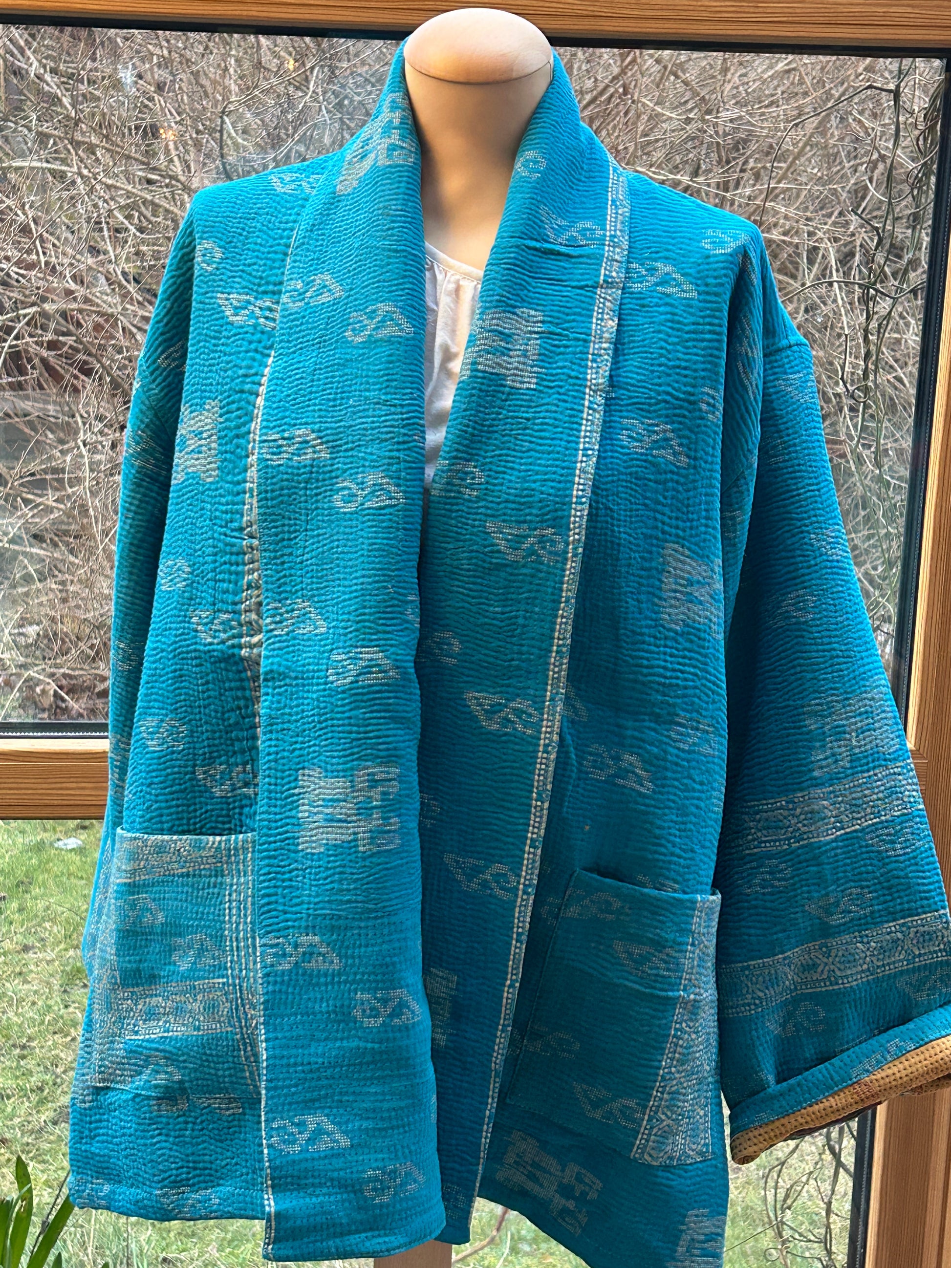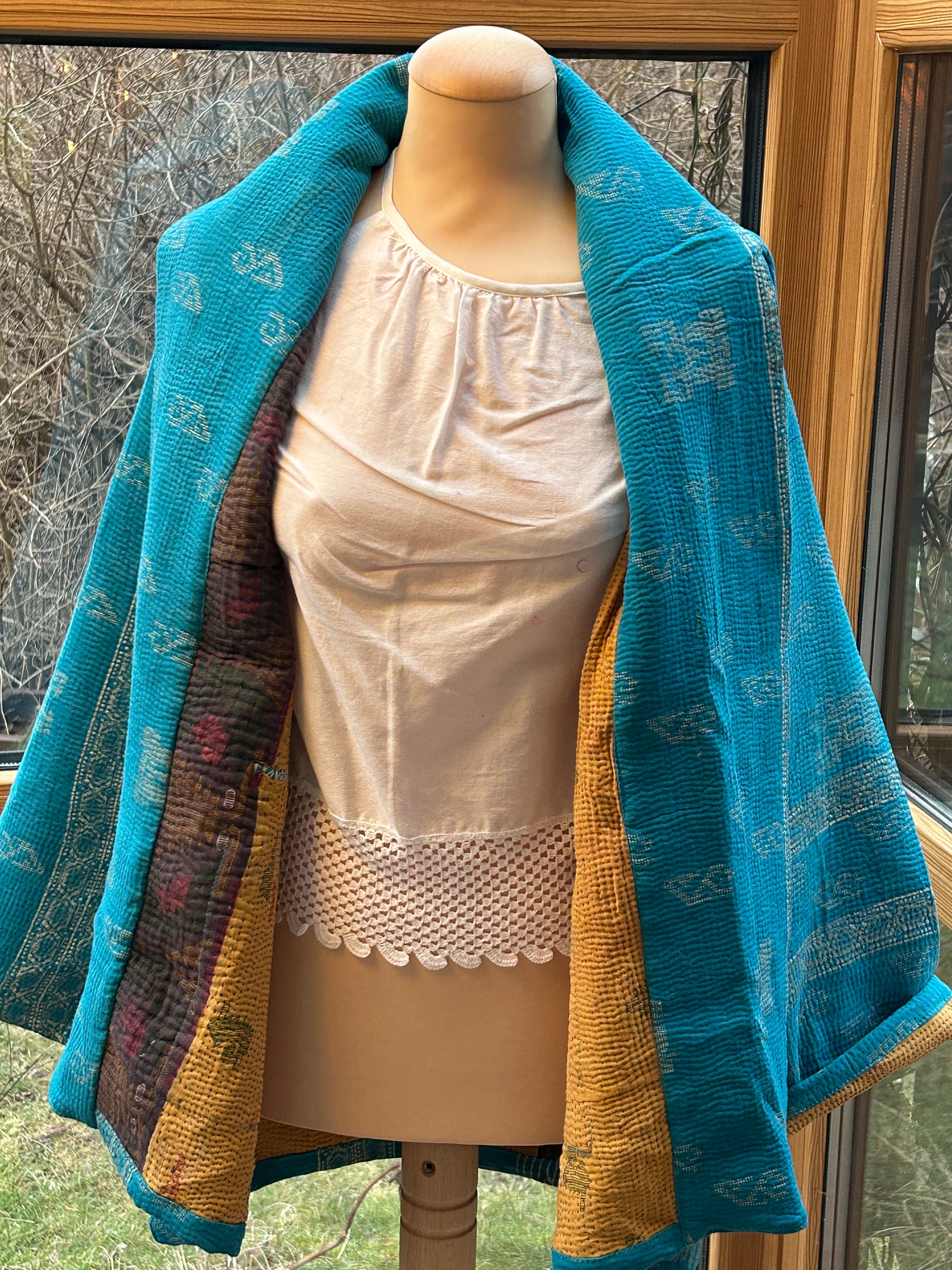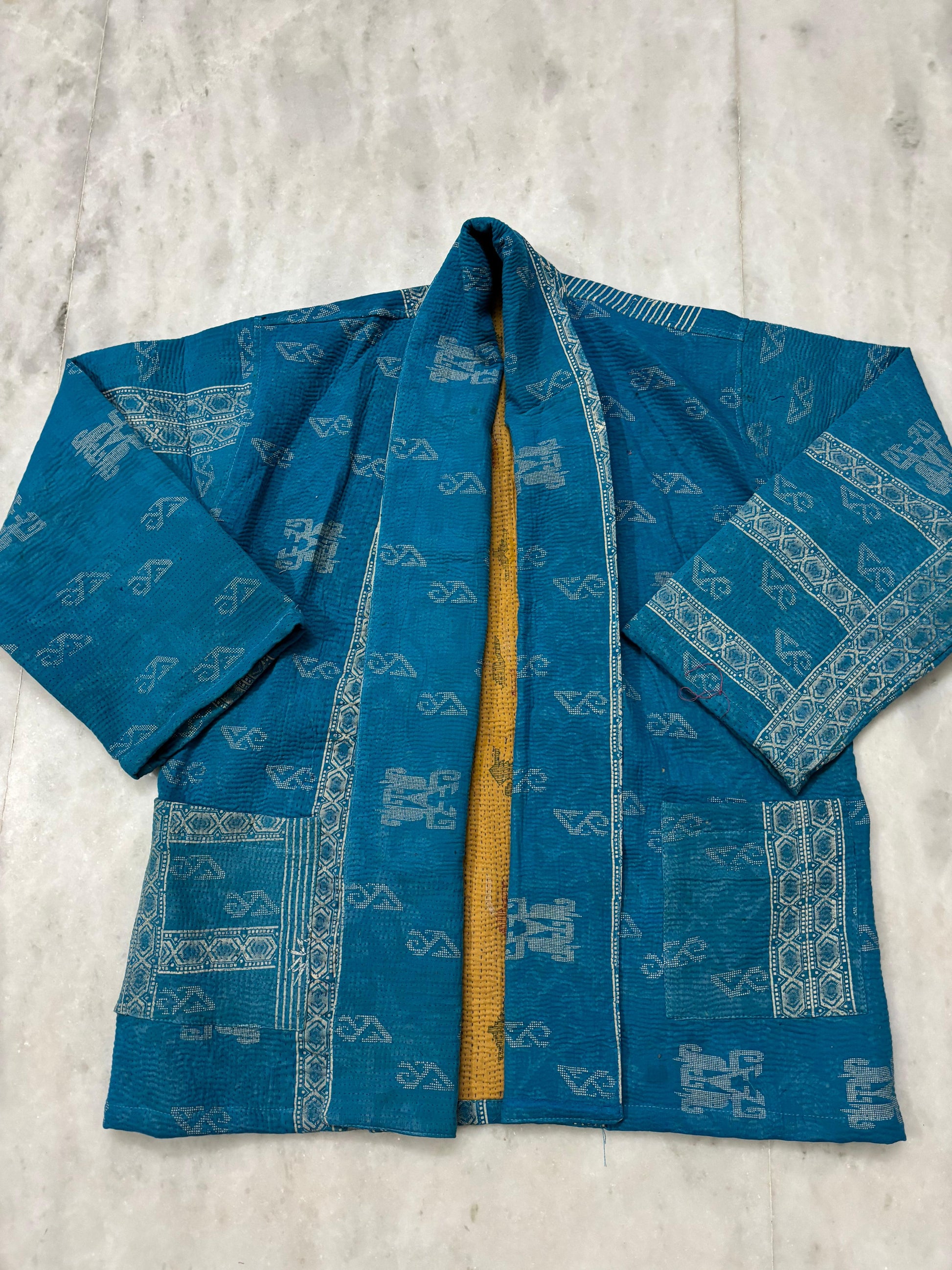 Felles for alle kanthaprodukter er at de blir sydd av resirkulerte materialer som legges oppå hverandre og sys sammen med "tråklesting", lag på lag.På den måten gis slitte stoffer nytt liv. Ikke sjelden synes små lapper og forsterkinger av stoffet. Dette gir plaggene sin sjarm. Tykkelsen på stoffet kan variere avhengig av hvor mange lag det består av.Dette er en romslig blazermodell. Påsydde lommer.Sjalskrage.