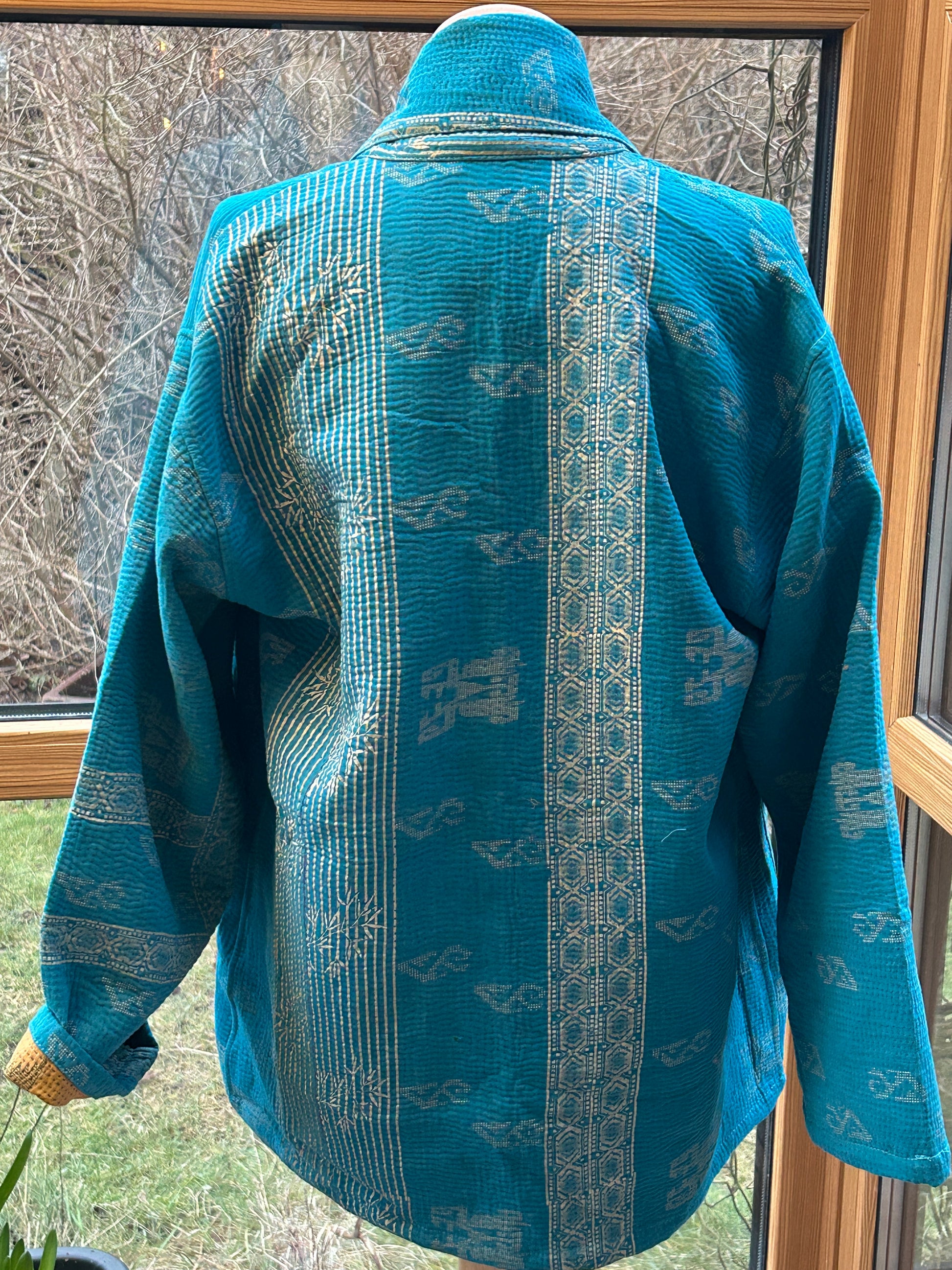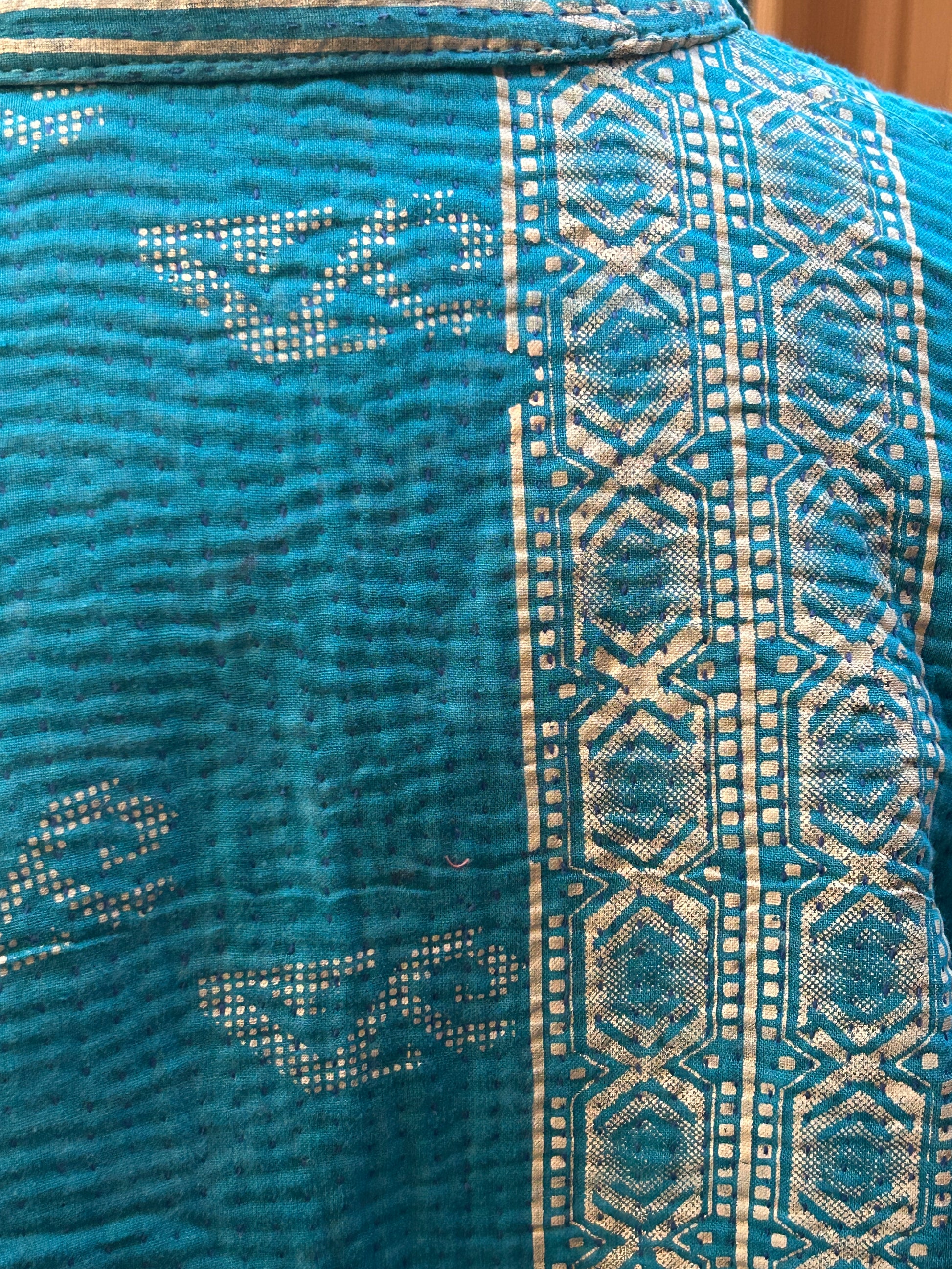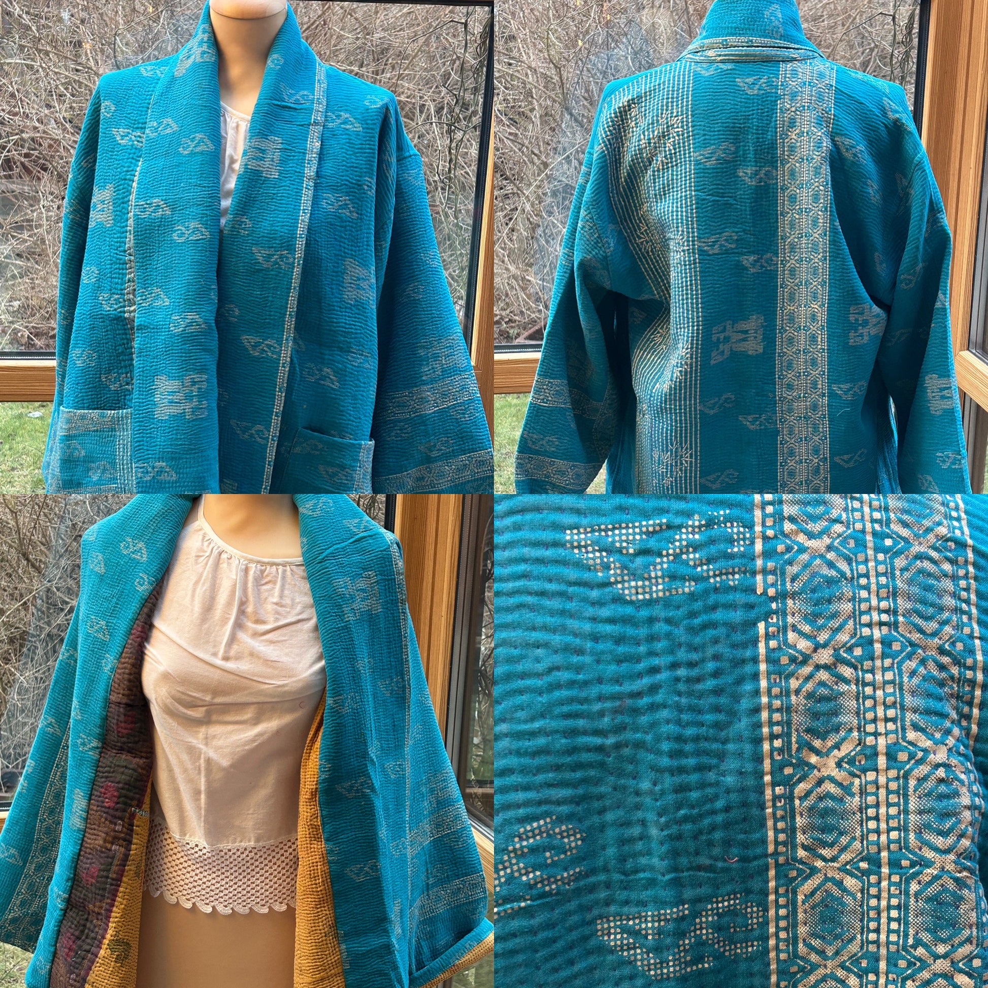 Felles for alle kanthaprodukter er at de blir sydd av resirkulerte materialer som legges oppå hverandre og sys sammen med "tråklesting", lag på lag.På den måten gis slitte stoffer nytt liv. Ikke sjelden synes små lapper og forsterkinger av stoffet. Dette gir plaggene sin sjarm. Tykkelsen på stoffet kan variere avhengig av hvor mange lag det består av.Dette er en romslig blazermodell. Påsydde lommer.Sjalskrage.