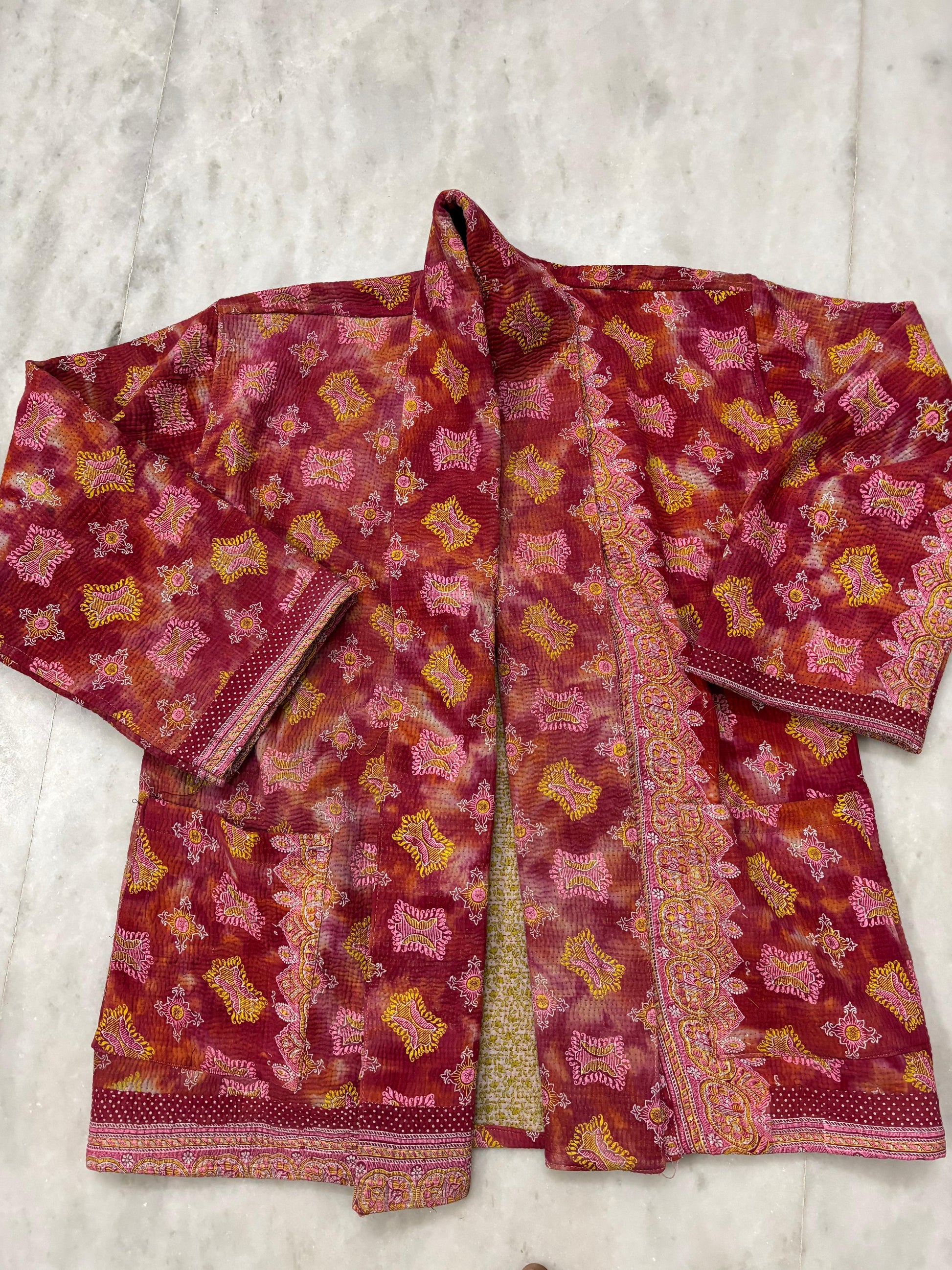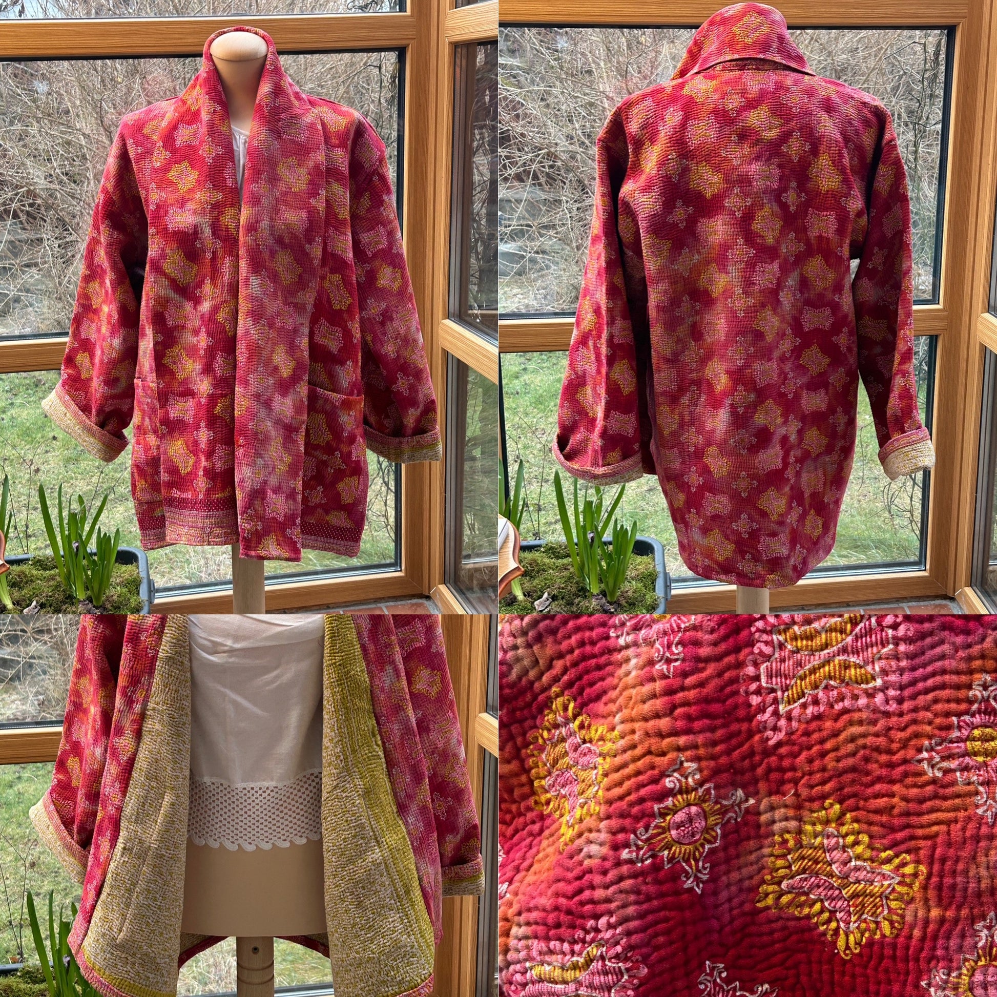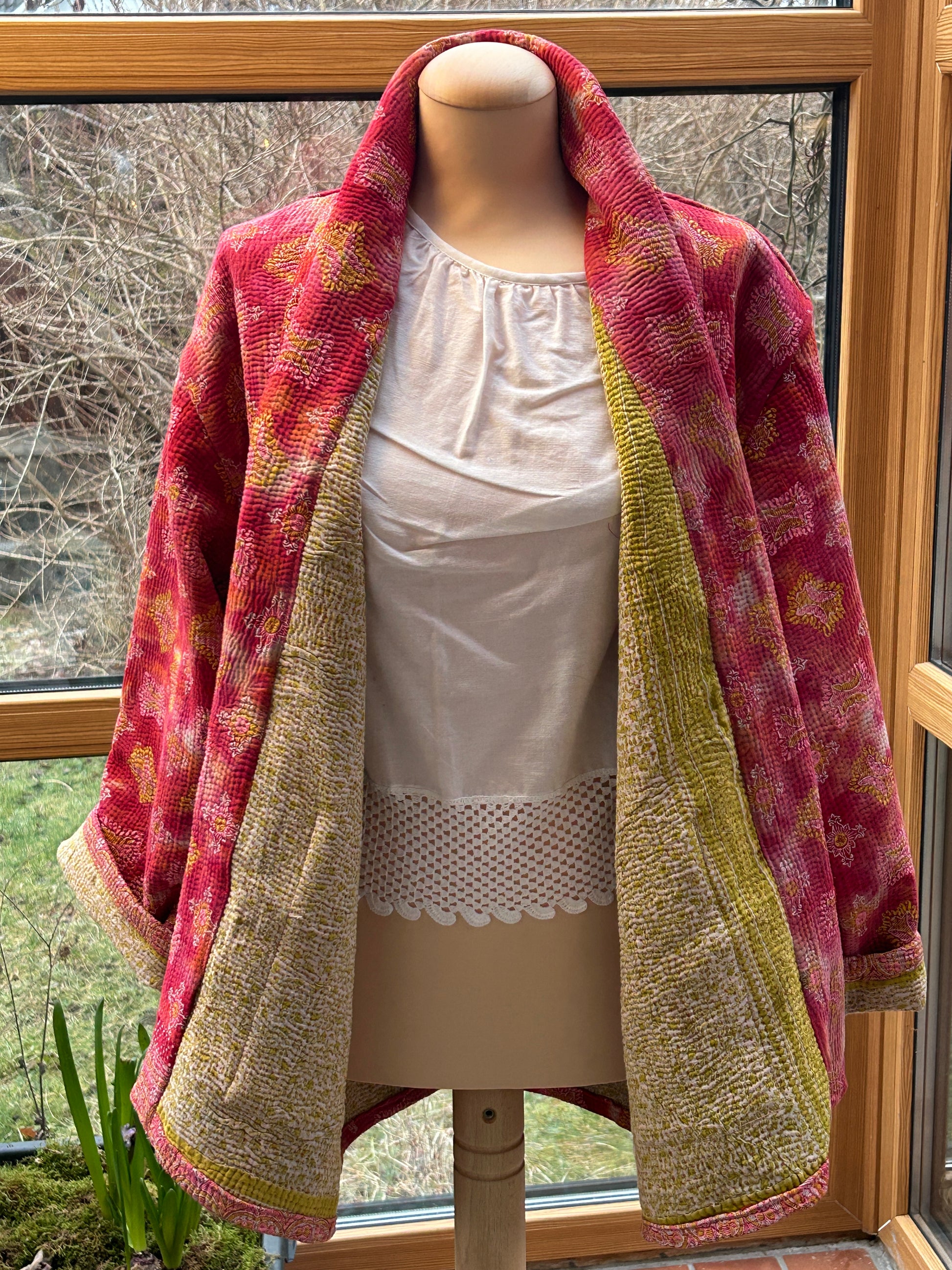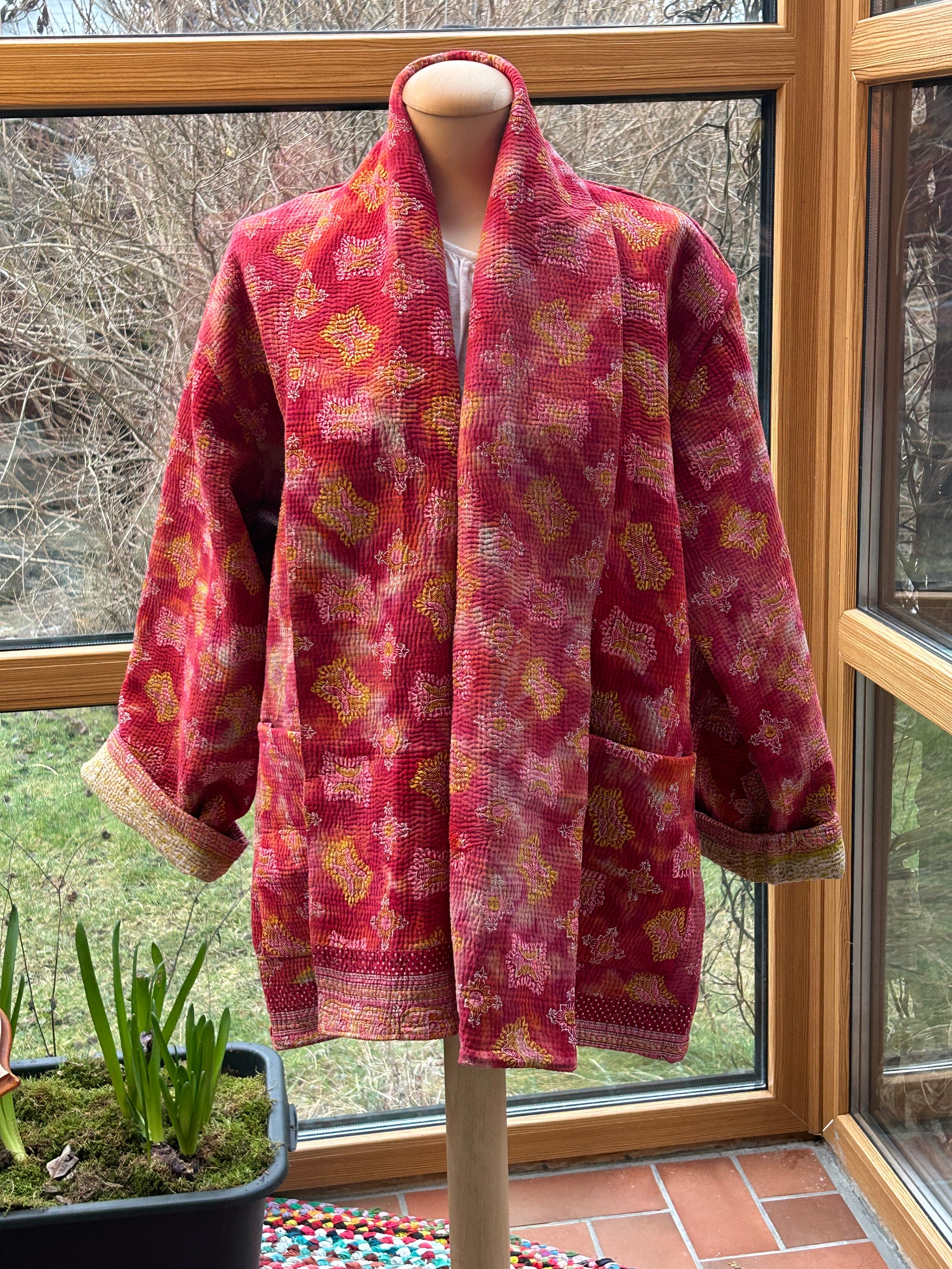 Felles for alle kanthaprodukter er at de blir sydd av resirkulerte materialer som legges oppå hverandre og sys sammen med "tråklesting", lag på lag.På den måten gis slitte stoffer nytt liv. Ikke sjelden synes små lapper og forsterkinger av stoffet. Dette gir plaggene sin sjarm. Tykkelsen på stoffet kan variere avhengig av hvor mange lag det består av. Dette er en romslig blazermodell. Påsydde lommer.Sjalskrage.