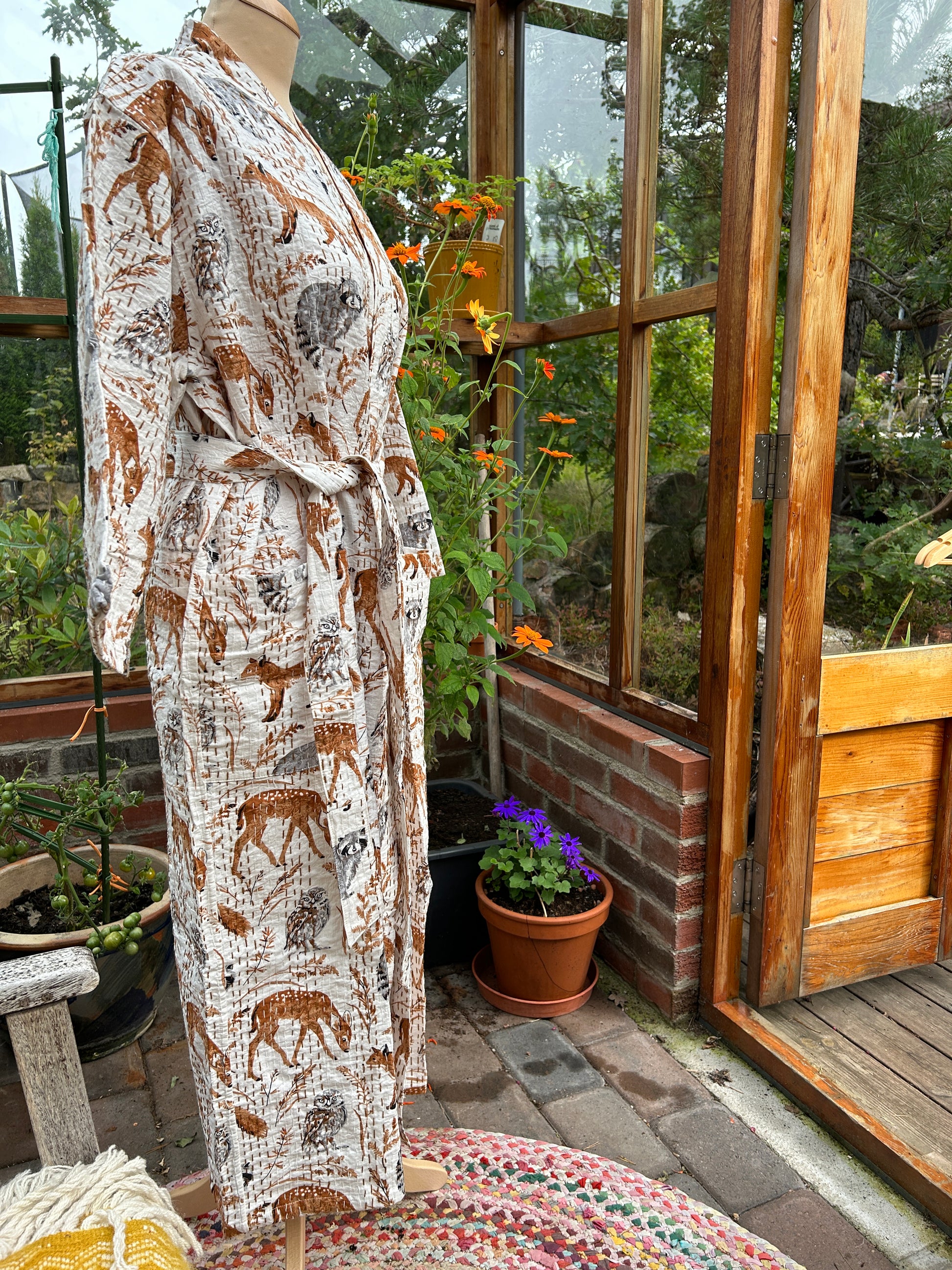 Fra kvinnelig småskalaprodusent i New Dehli. Ren bomull. One size. store påsydde lommer og knytebelte.