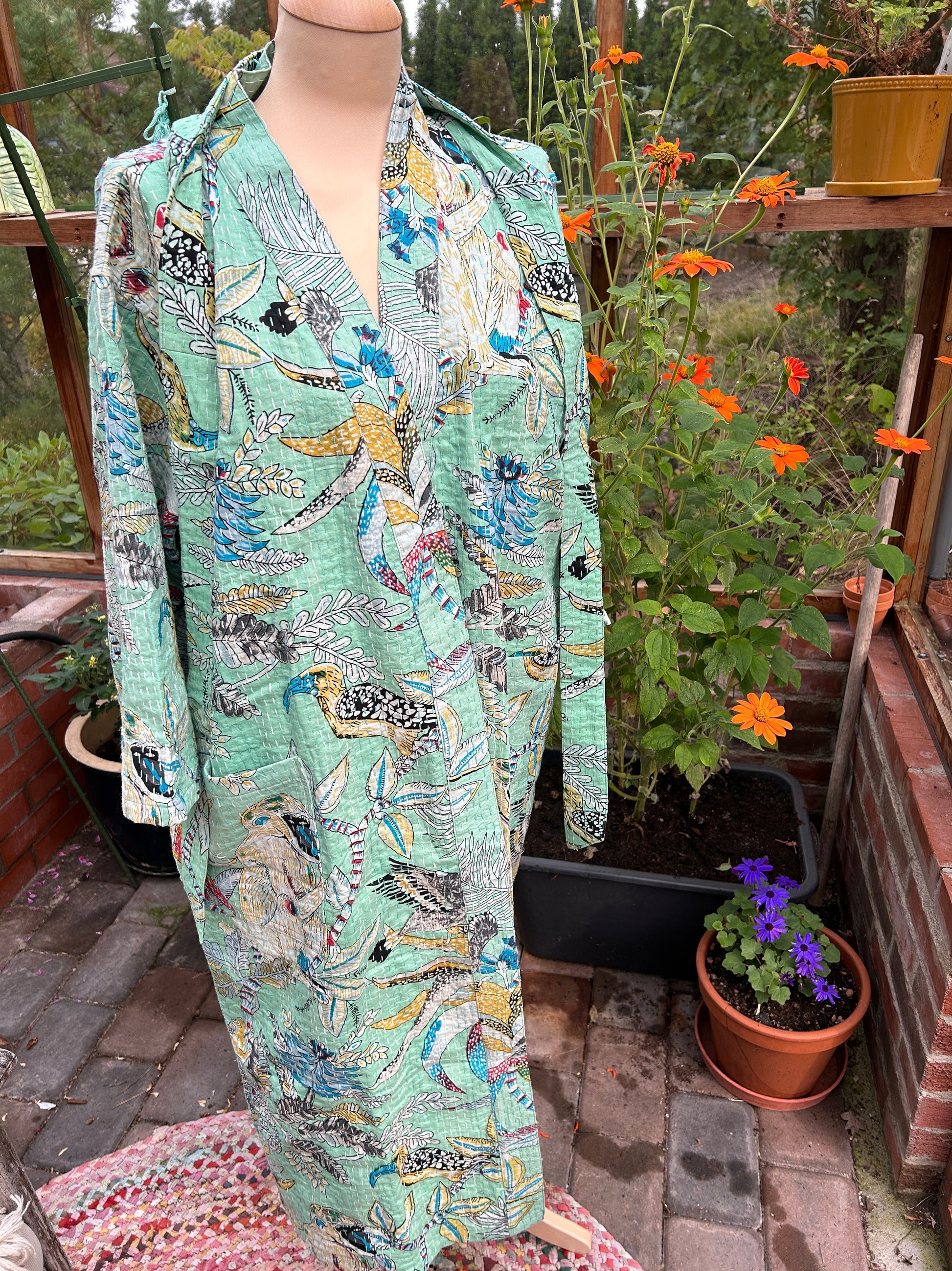 Lang kantha kimono,mint bunnfarge.Mønster med tropiske blomster, aper og fugler.