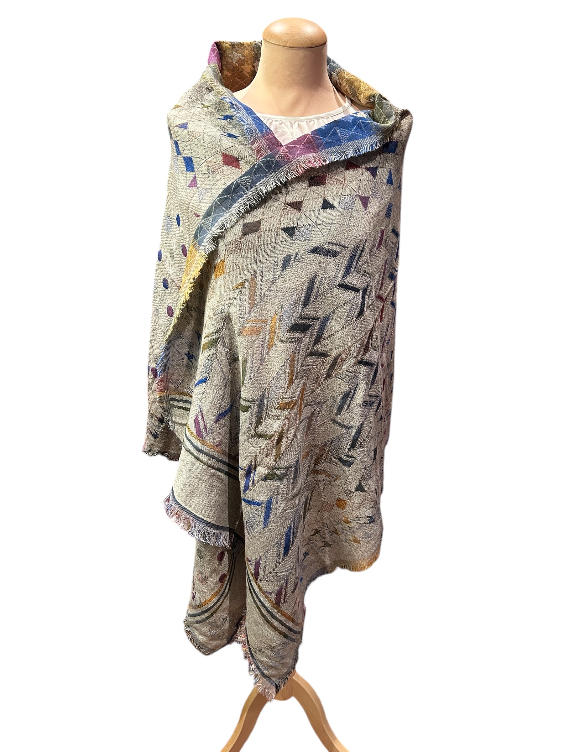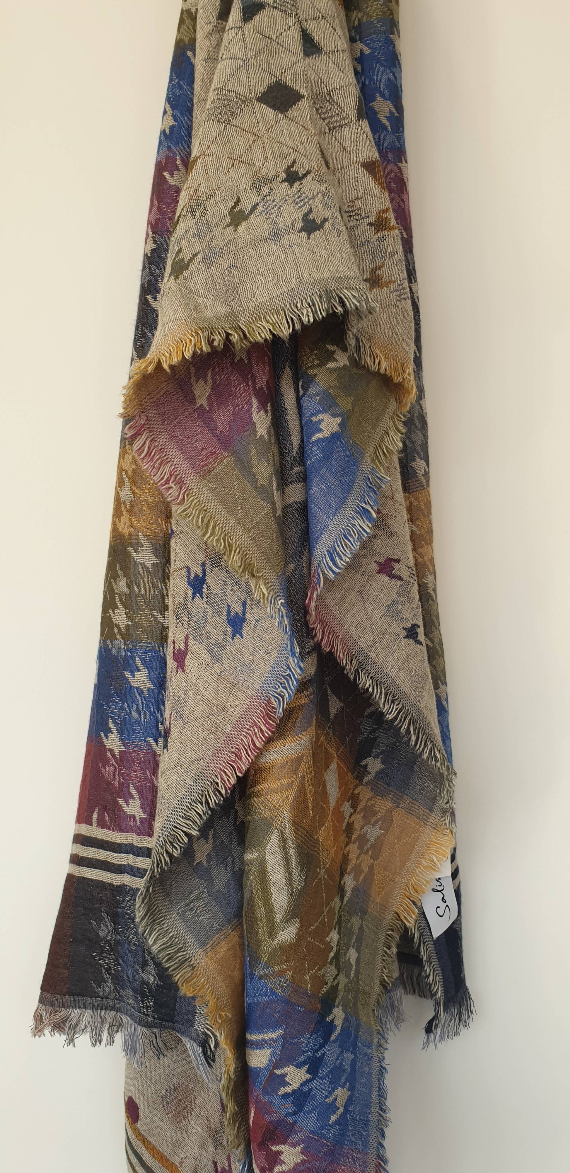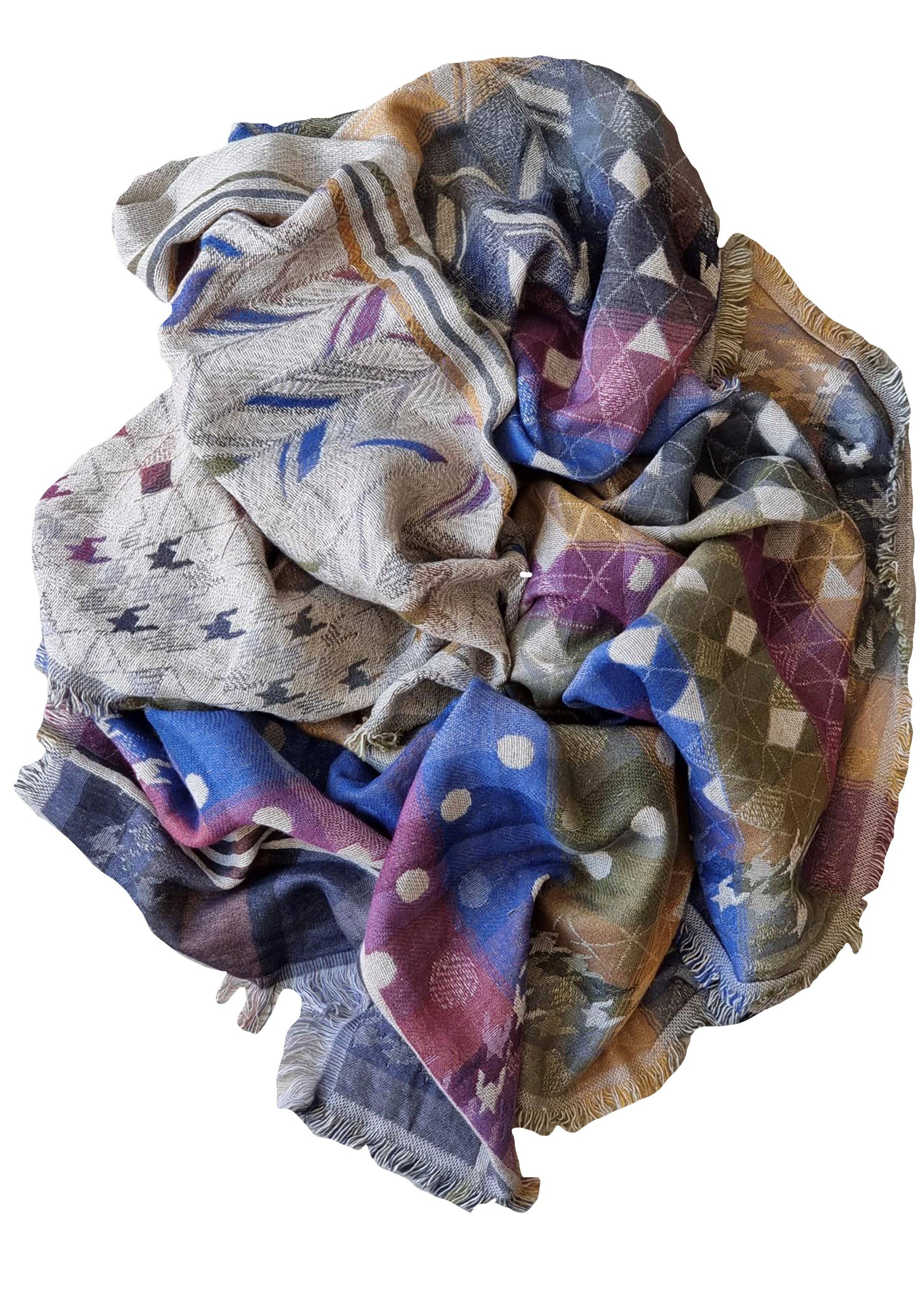 Et Jacquard-vævet tørklæde med en neutral baggrund og et sammenflettet design af prikker, diamantformer og blandet design. Den ene side har afdæmpede toner, og den anden er omvendt med lysere toner. Kan bruges som sjal/omslag samt som tørklæde.