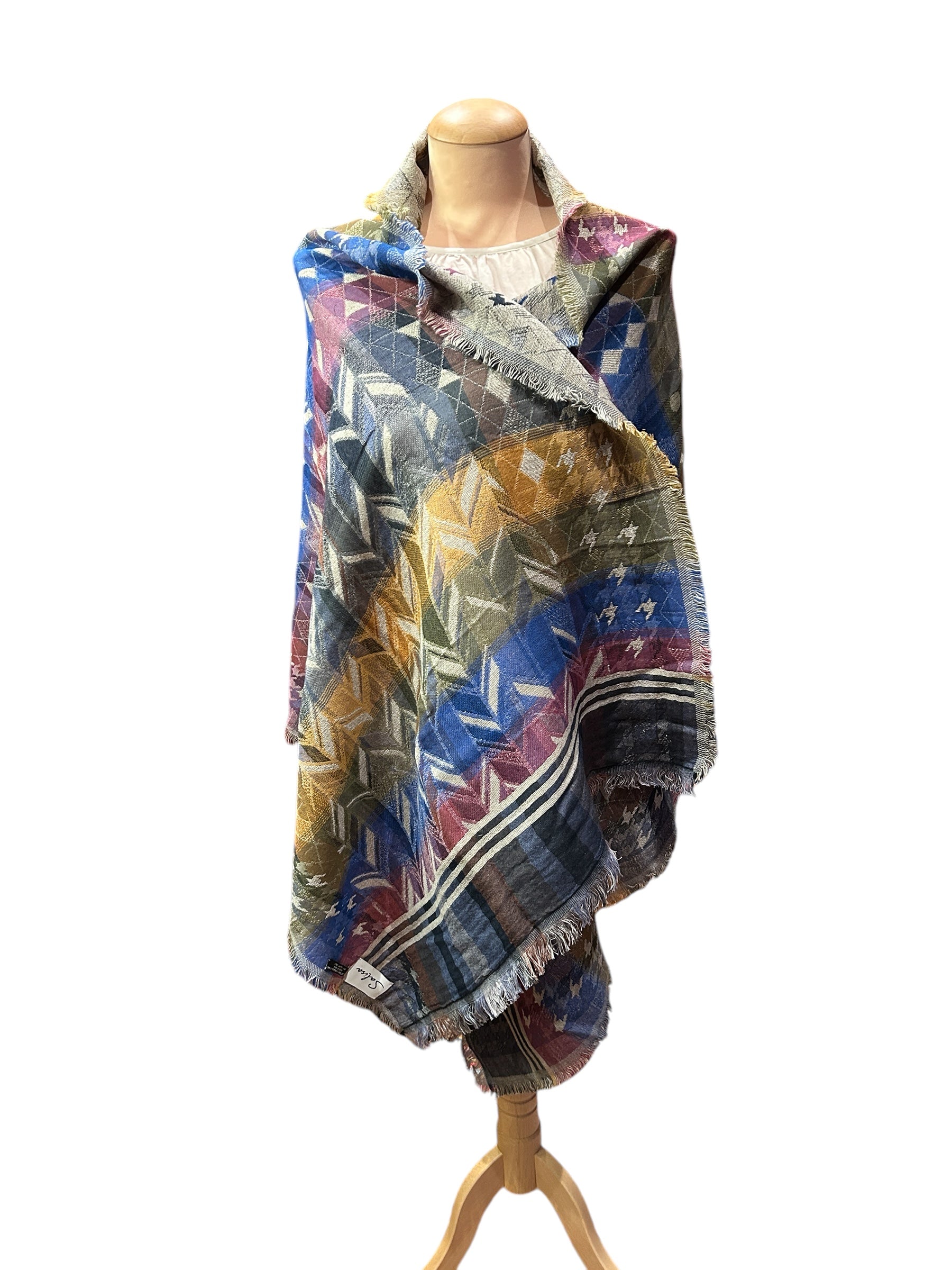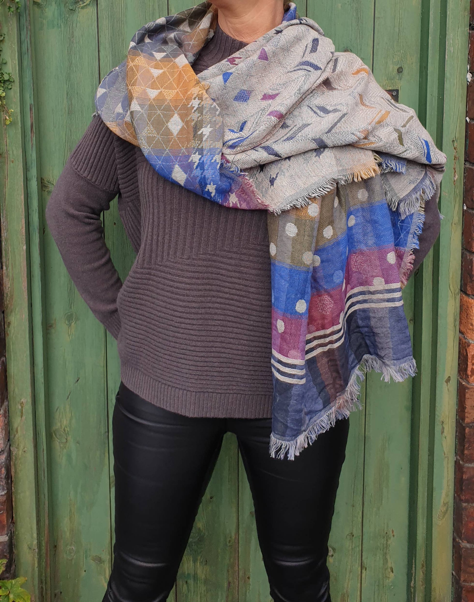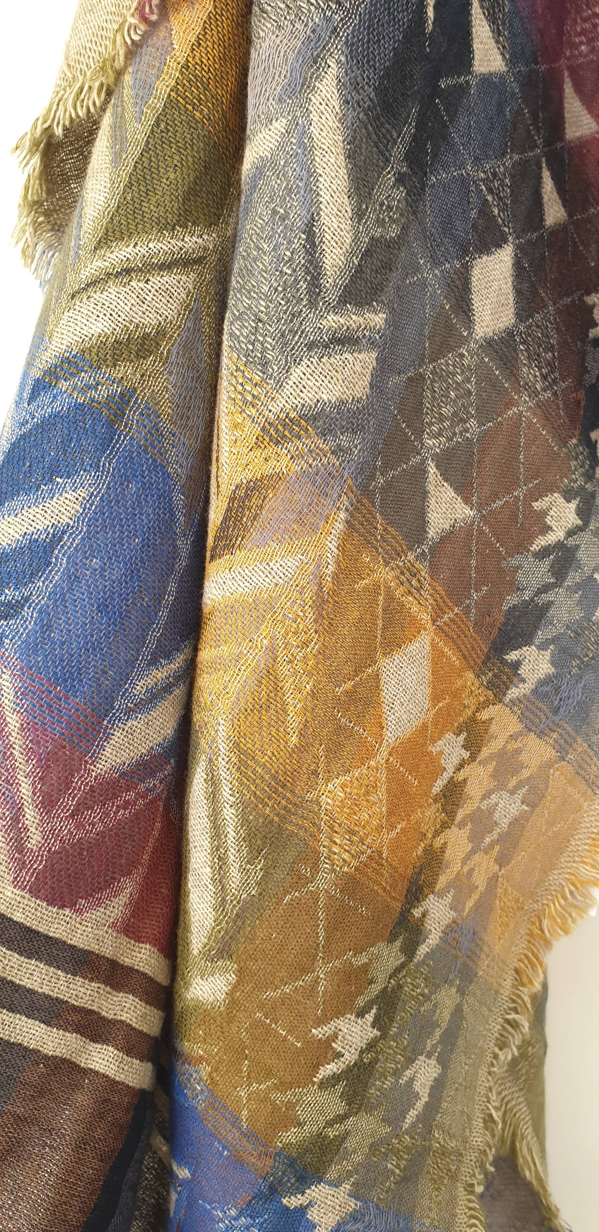 Et Jacquard-vævet tørklæde med en neutral baggrund og et sammenflettet design af prikker, diamantformer og blandet design. Den ene side har afdæmpede toner, og den anden er omvendt med lysere toner. Kan bruges som sjal/omslag samt som tørklæde.