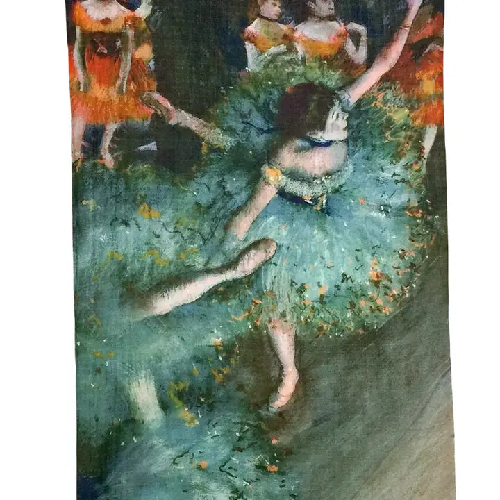 Smukt stort tørklæde med Degas Ballerina. Lavet af blød og ikke-kløende uld af høj kvalitet sammen med silke, let at kombinere med ethvert outfit.Også dejligt at give som gave.Materiale: 80% uld 20% silke Størrelse: 100x180 cm .