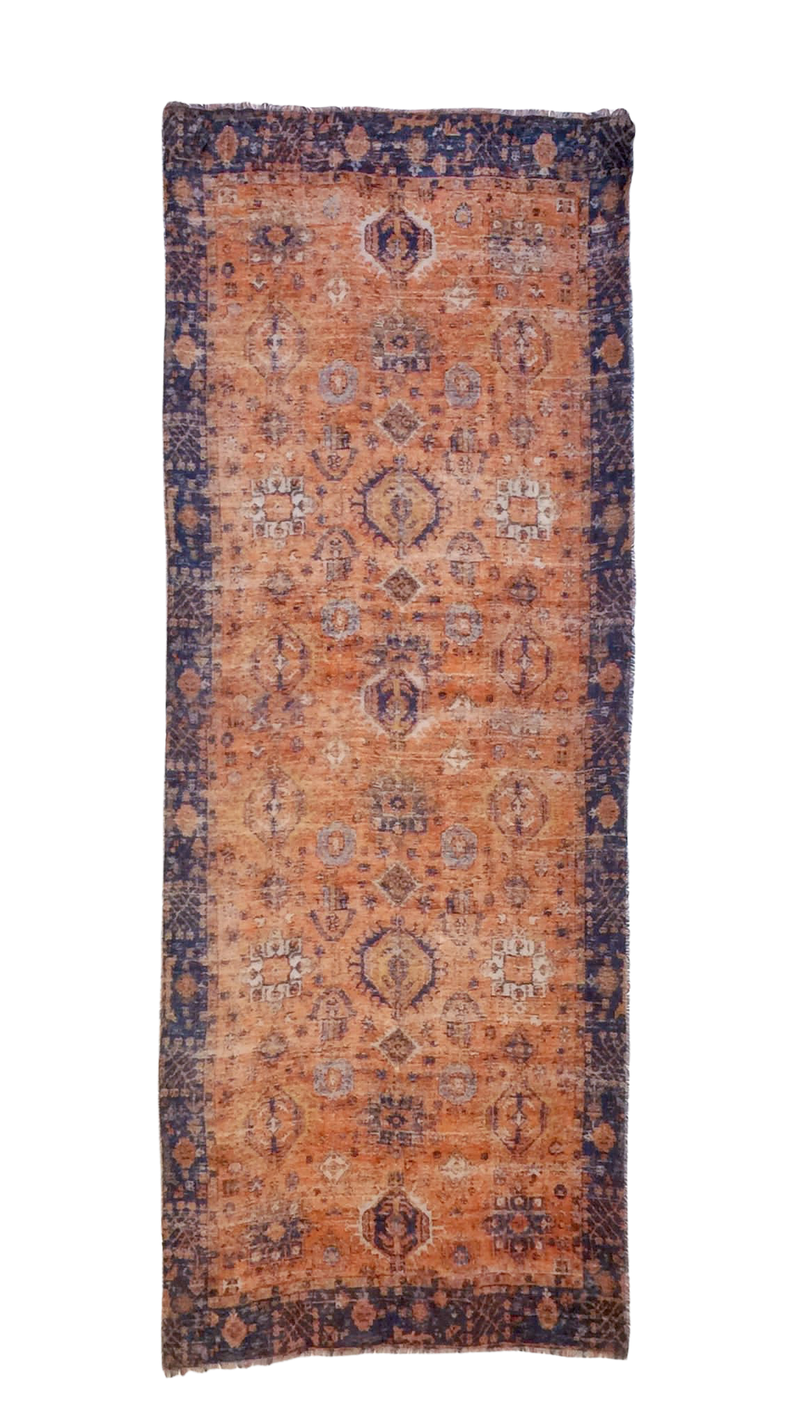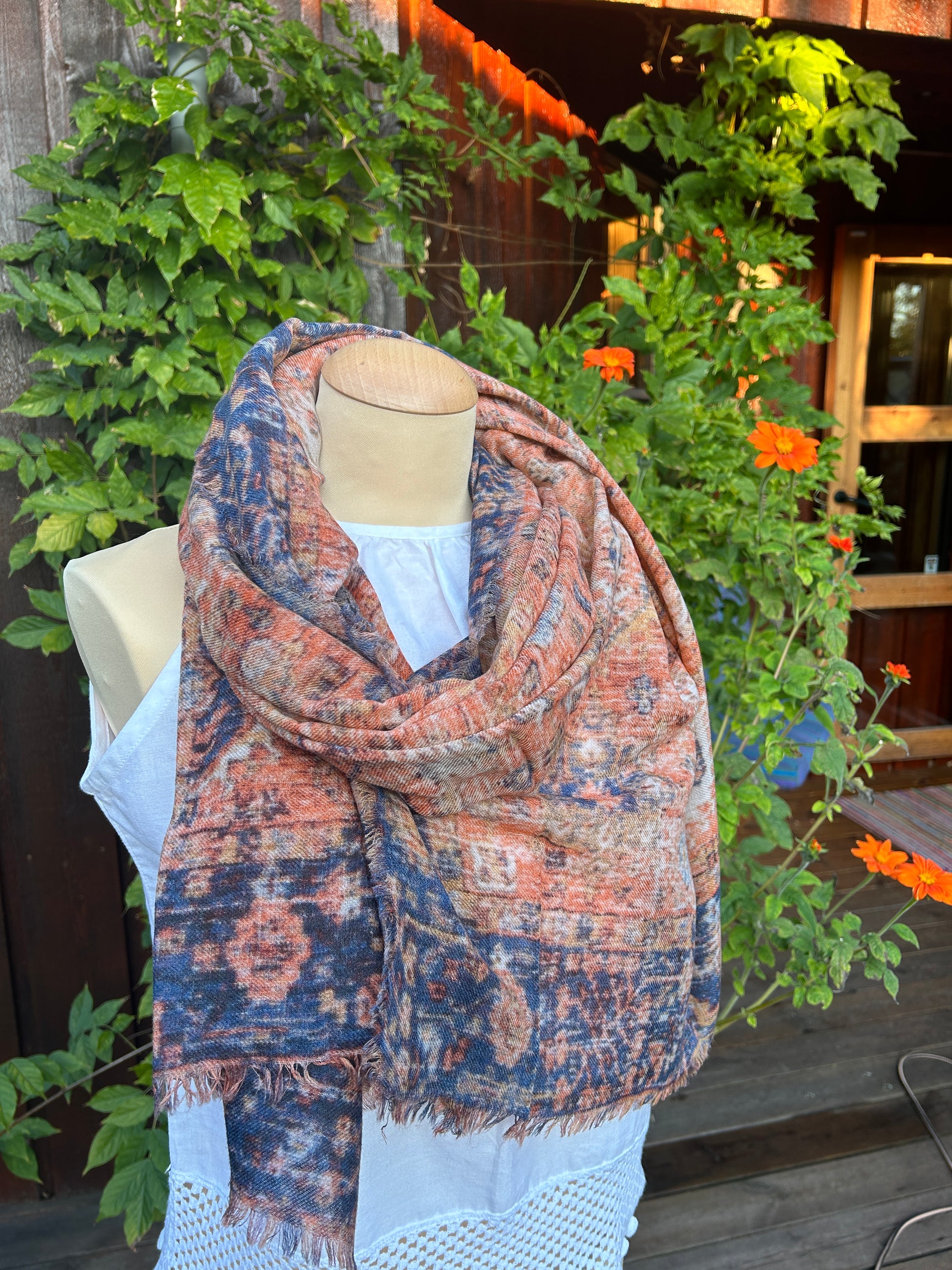 Smukt tørklæde med autentisk tæppe orange kunsttryk. Tilhører vores nyeste kollektion. Lavet af uld af god kvalitet, er let at kombinere med ethvert outfit og er et ægte blikfang for enhver butik. Også dejligt at give som gave. Materiale: 100% uld Størrelse: 70x180 cm