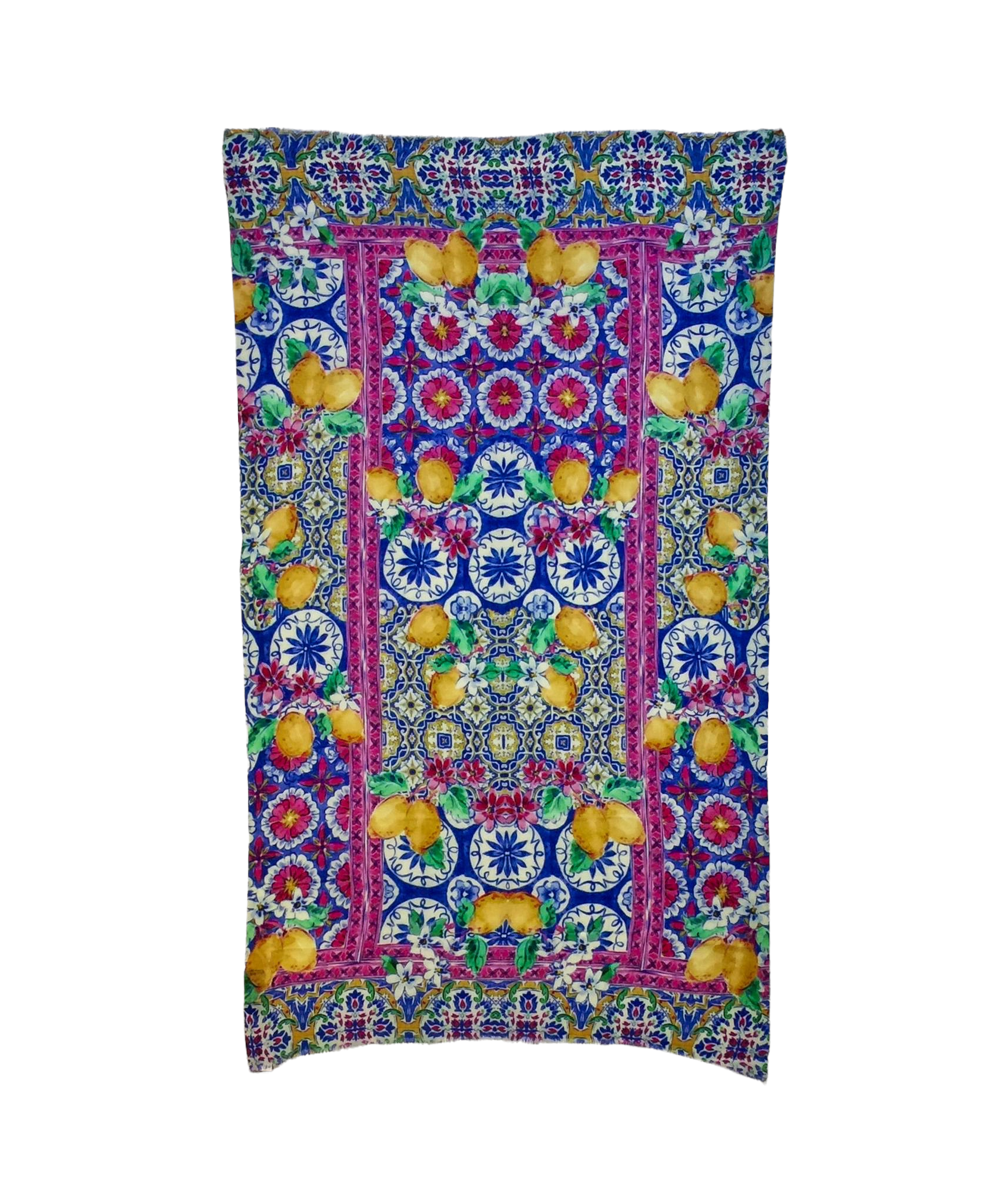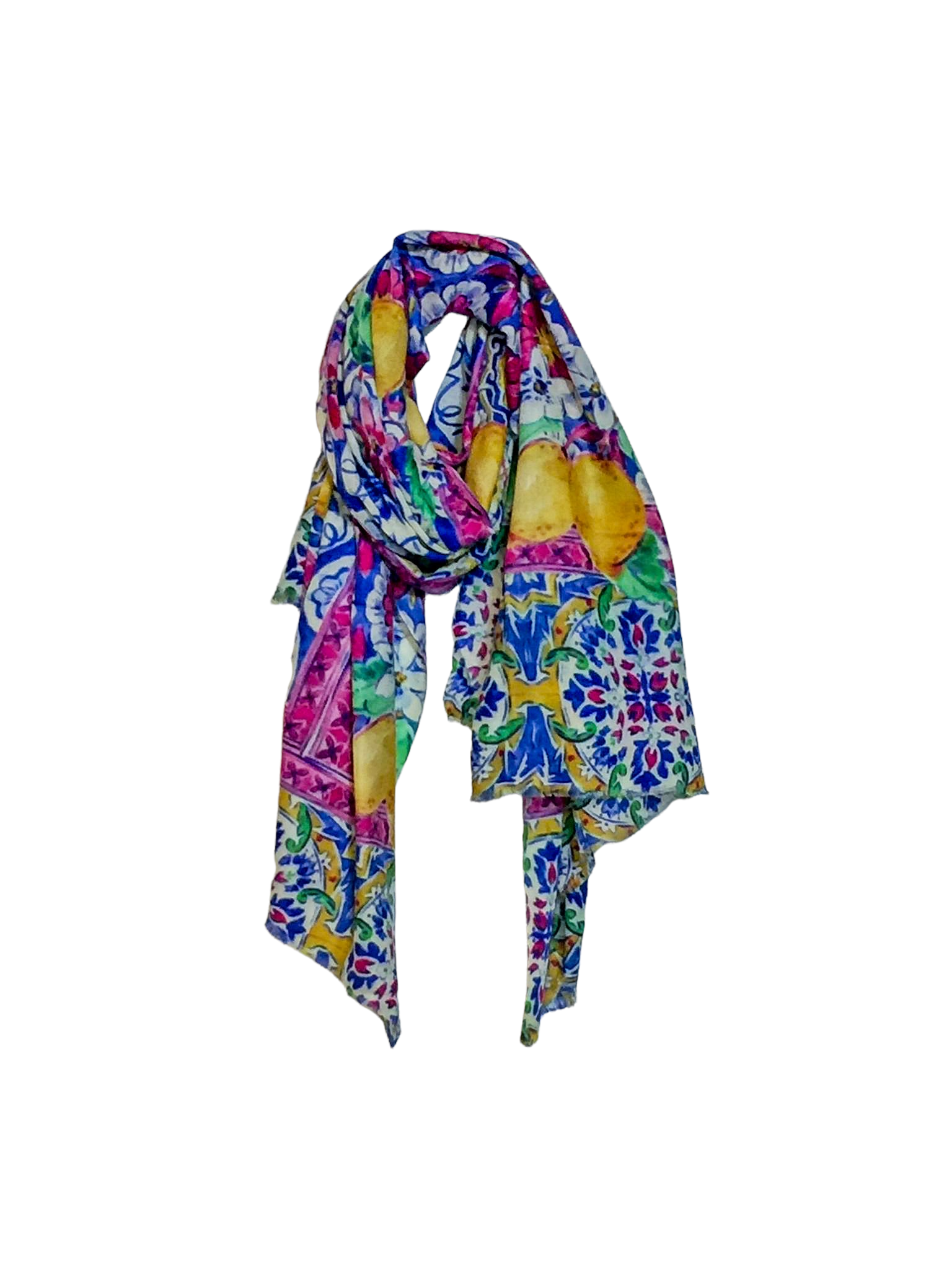 Smukt tørklæde med fliser med citrusfrugter print .Materiale: 80% uld 20% silke Størrelse: 100x180 cm Artikel nummer: 4407