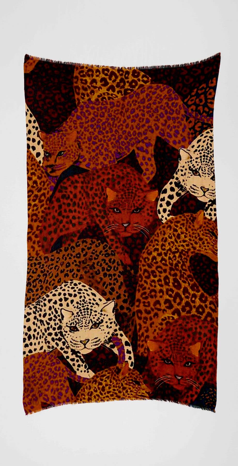 Smukt tørklæde med leopard gruppeprint . Lavet af blød og ikke-kløende uld af høj kvalitet sammen med silke, let at kombinere med ethvert outfit.Også dejligt at give som gave.Materiale: 80% uld 20% silke Størrelse: 100x180 cm .