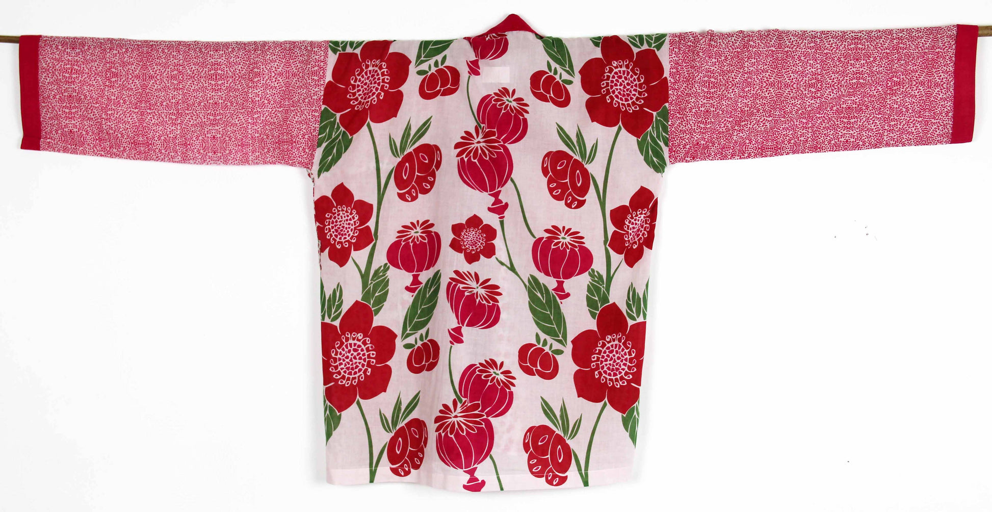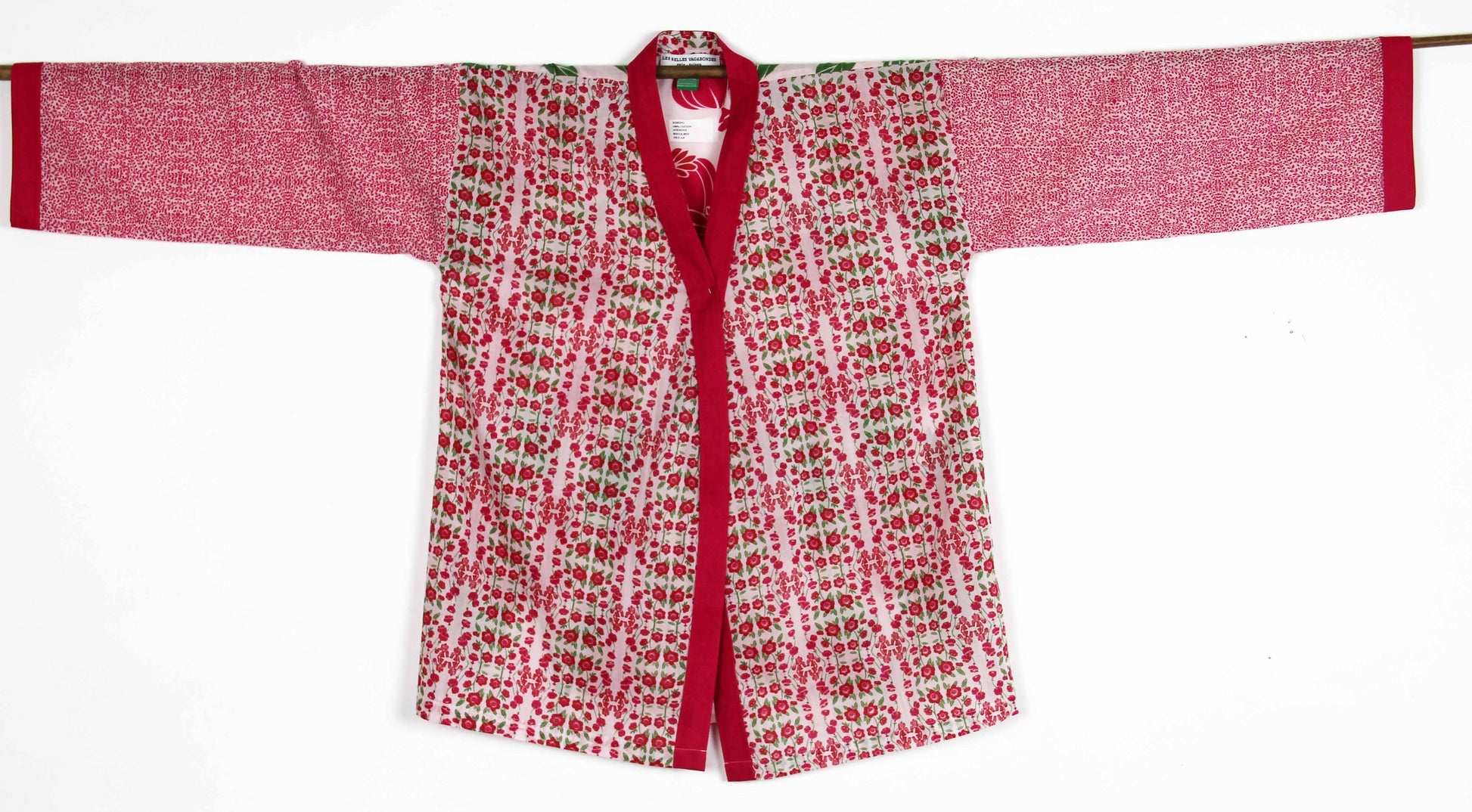 Mønsteret en designet for hånd i Frankrike, men jakken er vevet og trykket i India. En spesiell teknikk gjør bomullen ekstra lett og myk. Kimonoen veier 100 gram.