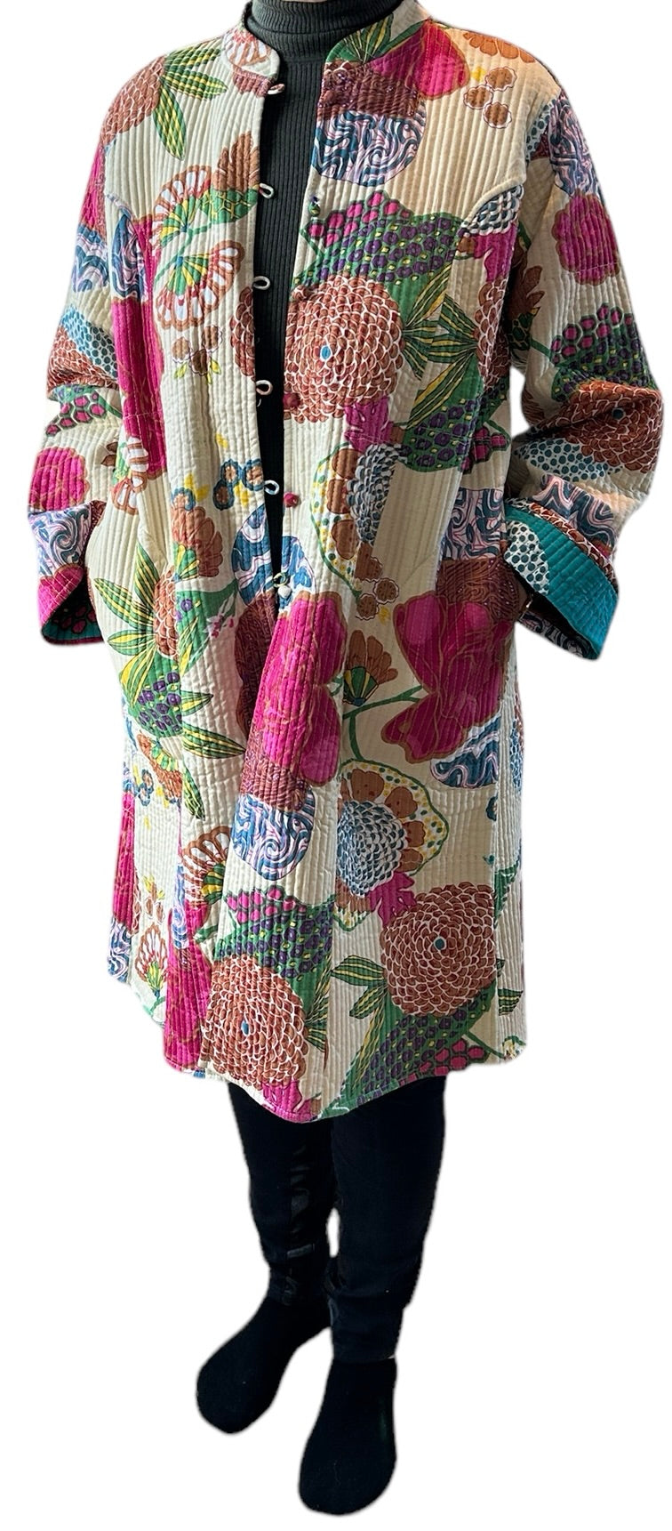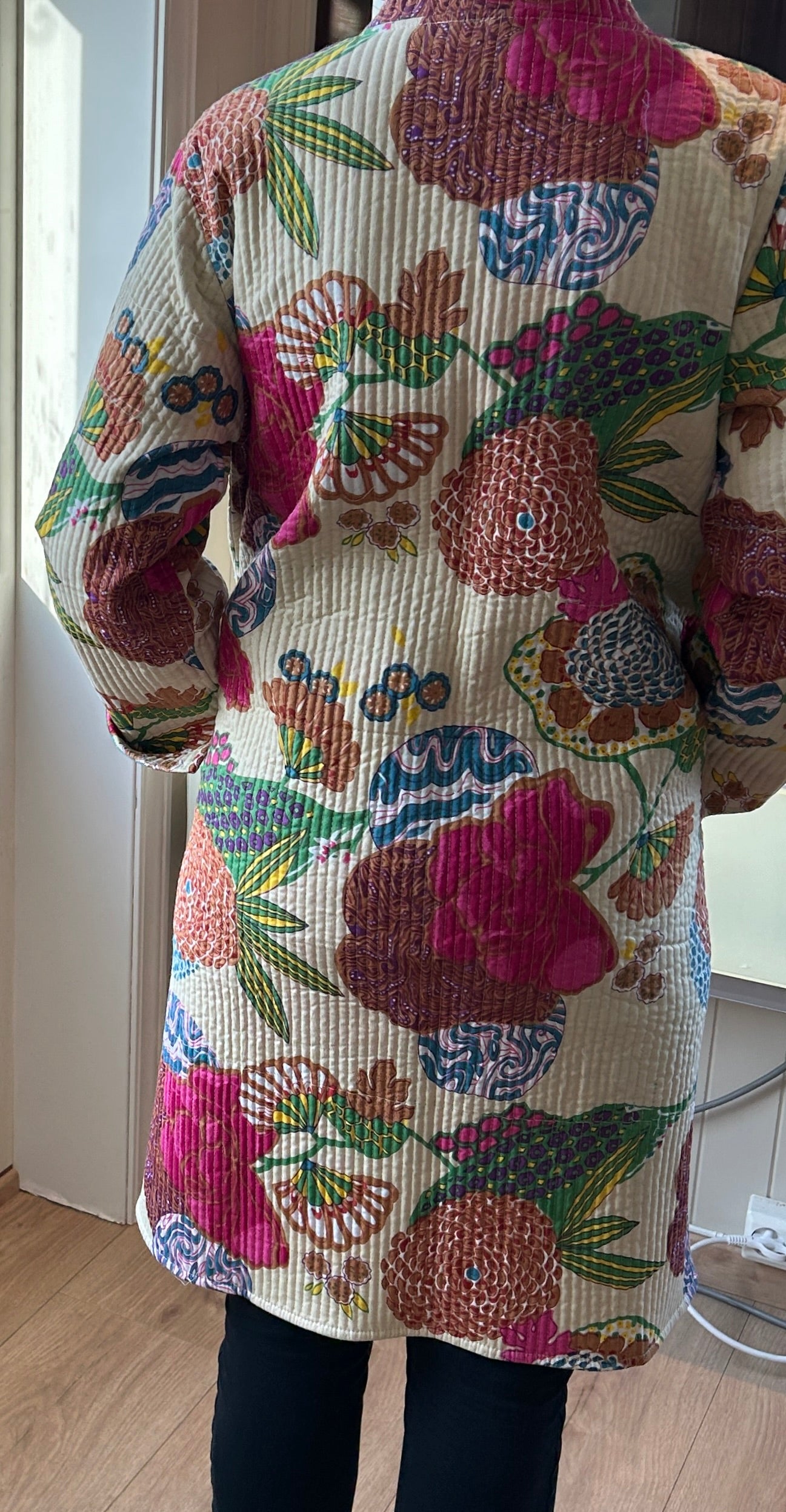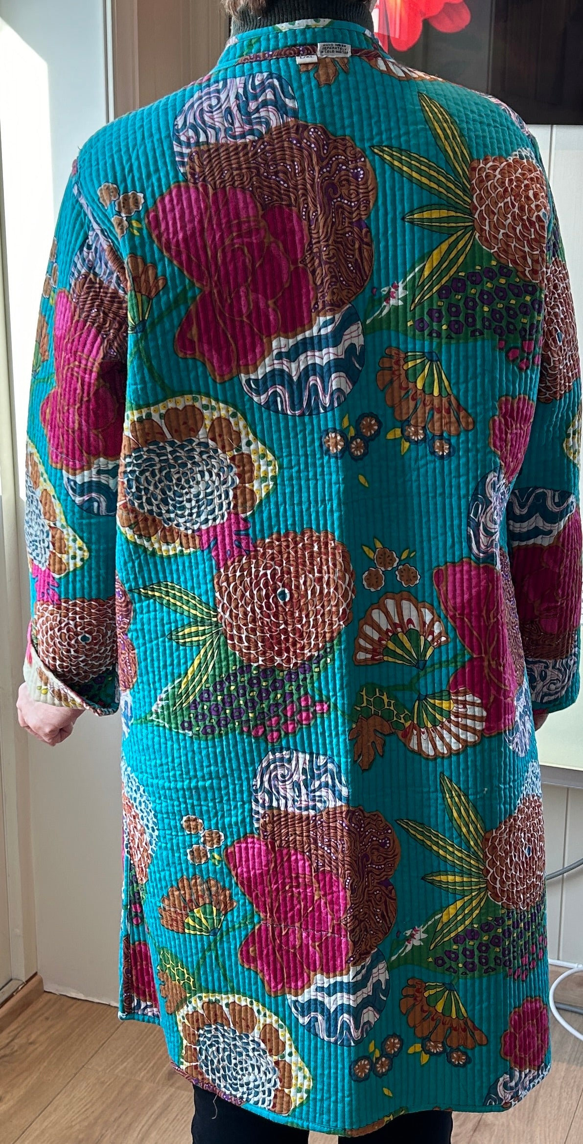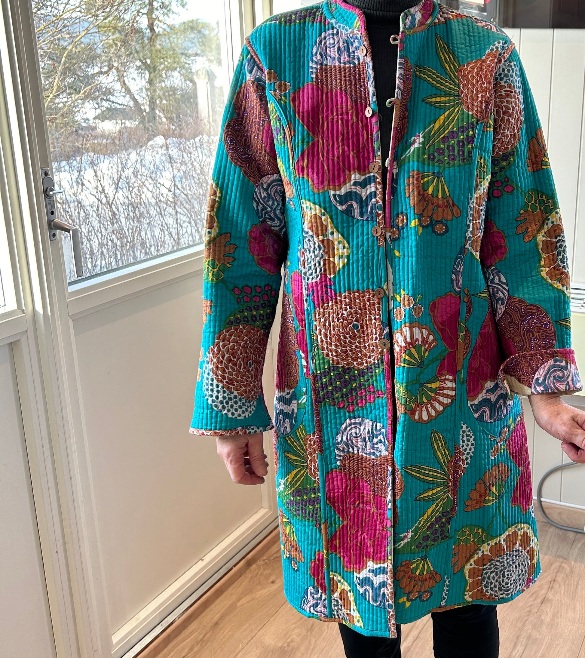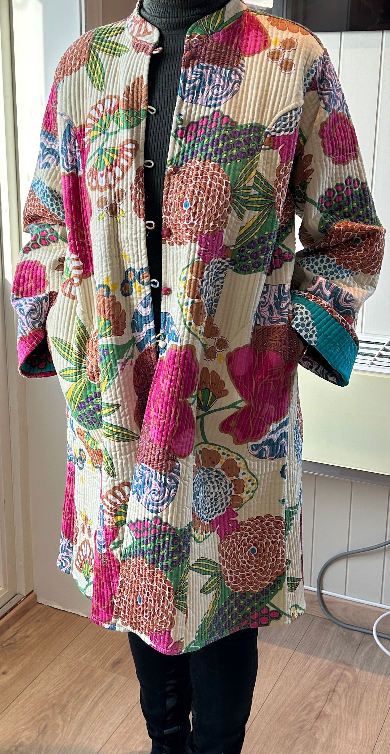 Denne lette bomullsjakken fra india er reversibel. Den har trukne knappwer, og kneppes lett fra begge sider. Romslige lommer på én side.