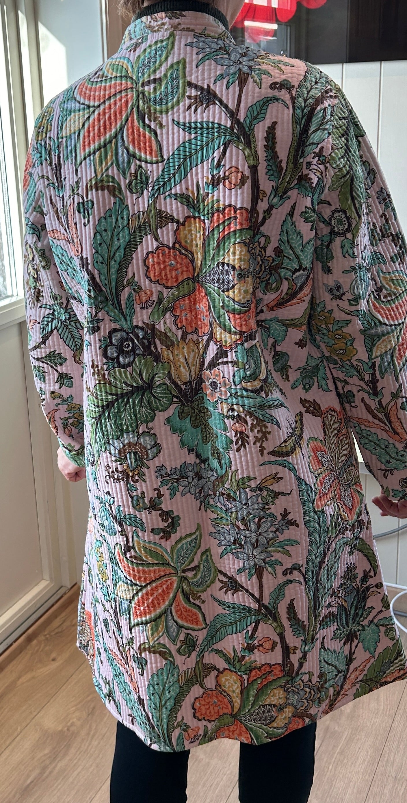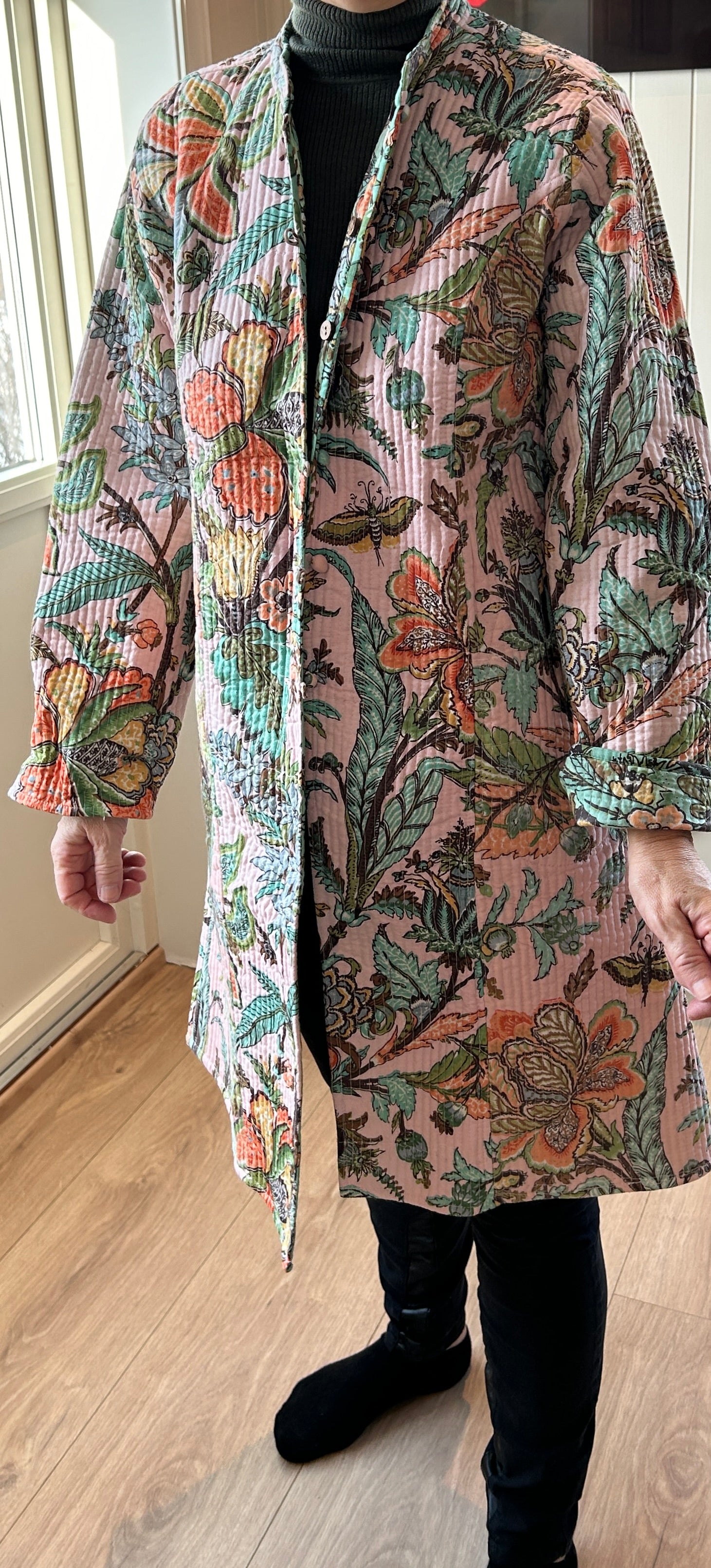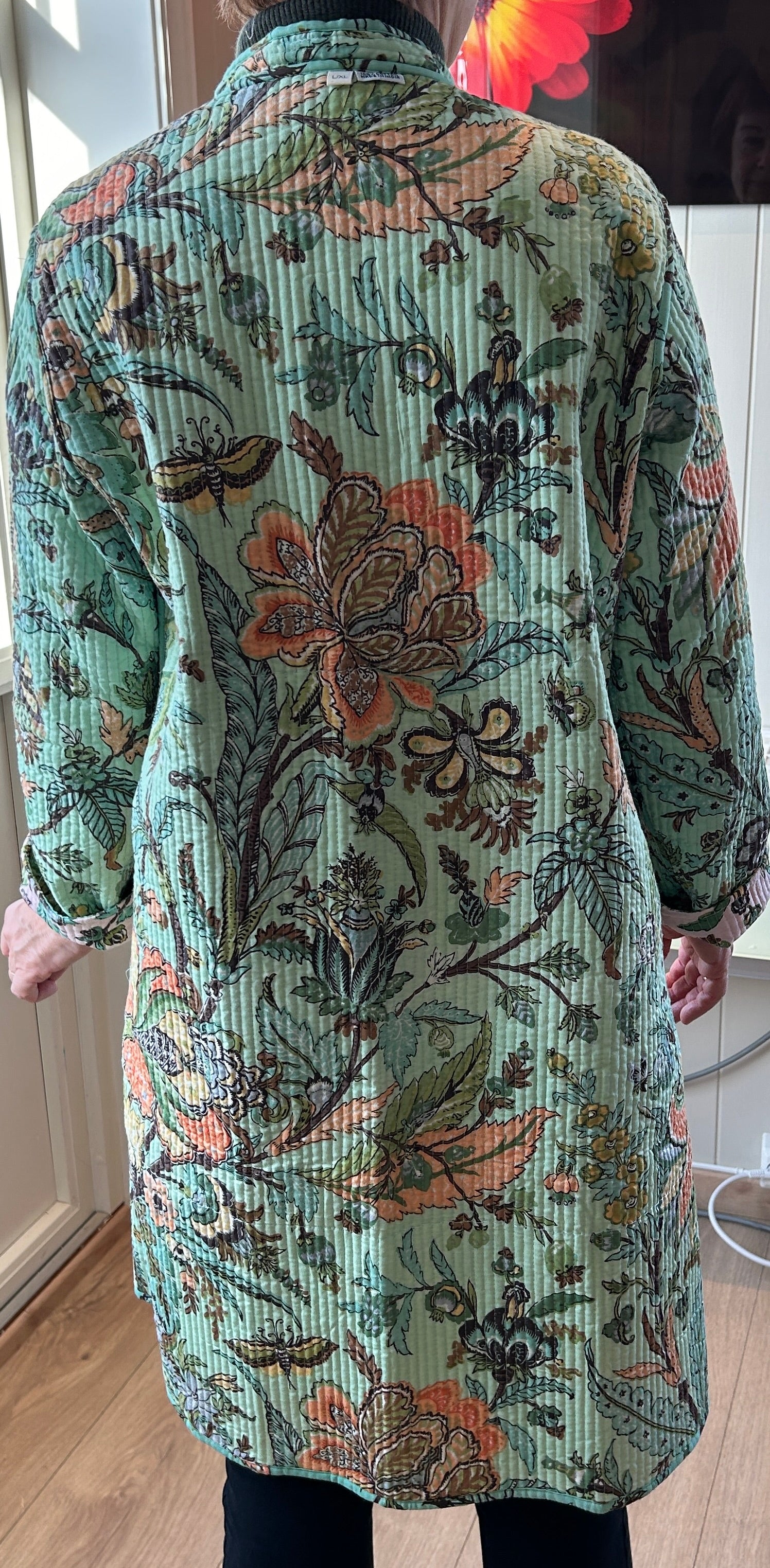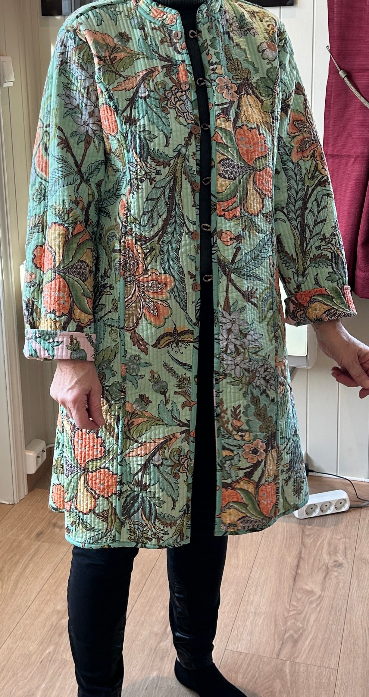Denne lette bomullsjakken fra india er reversibel. Den har trukne knappwer, og kneppes lett fra begge sider. Romslige lommer på én side.