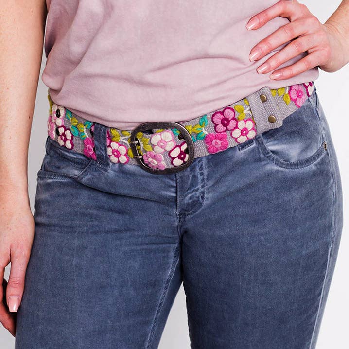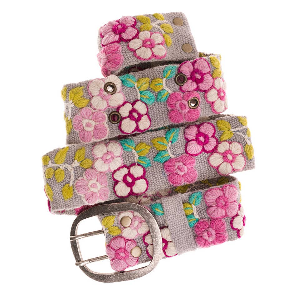 En smuk, næsten plastisk blomsterbort i fantastiske pink nuancer på grå baggrund pryder dette fortryllende broderede bælte fra Peru. Komplimenter er garanteret. Størrelser: S = ca. 75 cm lang, M = ca. 85 cm lang, L = ca. 95 cm lang (målene er fra spændet til det midterste bæltehul, hvert bælte har 5 huller, der ligger ca. 4,3 cm fra hinanden), Bredde: ca. 4,3 cm, Materiale: 100% uld