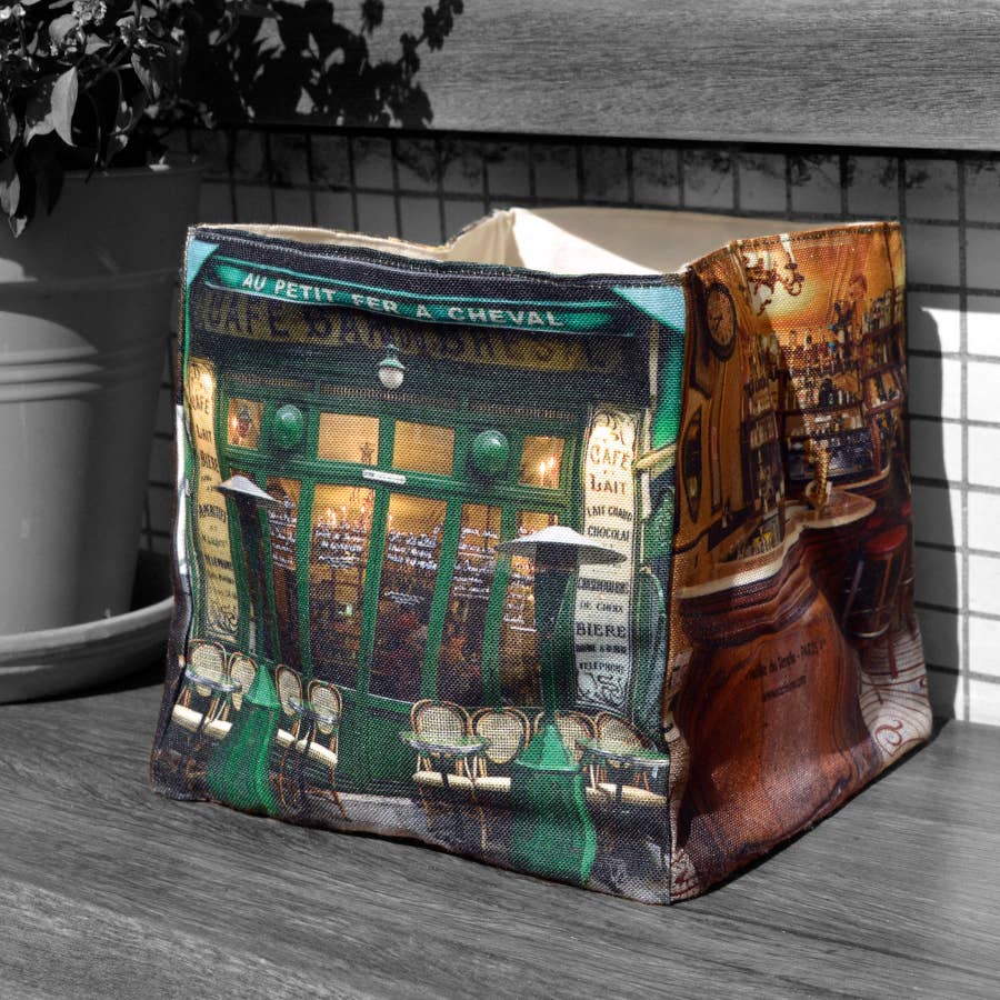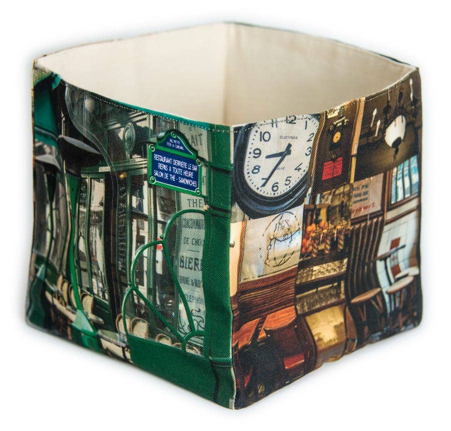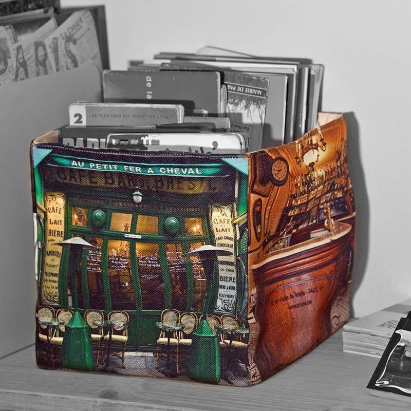 Tag en kaffepause på Au Petit Fer à Cheval ! Denne opbevaringsboks til hjemmet afspejler den autentiske atmosfære i denne parisiske bistro, som er ikonisk for Paris retro-kollektionen. Uanset om du foretrækker terrassen eller baren, morgenmad eller aperitif, kan du vælge den side, du bedst kan lide, på denne dekorative boks. Dækket af fotos taget fra alle vinkler af dette typiske sted, er denne stofbakke perfekt til at organisere dine ting, fra kælder til loft. Som en souvenirgave fra Paris er denne designboks fremstillet i Frankrig af genanvendt polyester, foret med økologisk bomuld. Økologisk, unik og praktisk, den kan nemt vaskes i maskine.